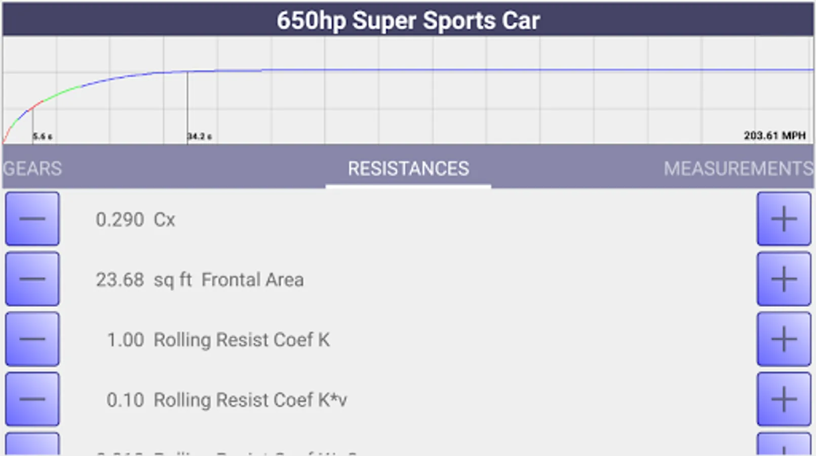 - Resistances (Cx, frontal area and rolling resistance coefficients).