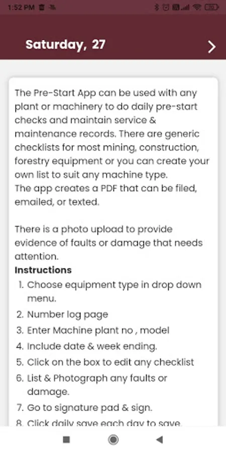 The Prestart App makes the daily checklist on machinery easy and paperless. Make your own list or use the standard list. Upload a photo to the checklist to document any faults or damage. The App can be used for any machine type or multiple machines. With a drop-down menu to choose the machine type you need. Can be used with, tower Crane, mining Equipment, forestry Equipment, farming Equipment and any machinery. Email, Text or save the file as a PDF.