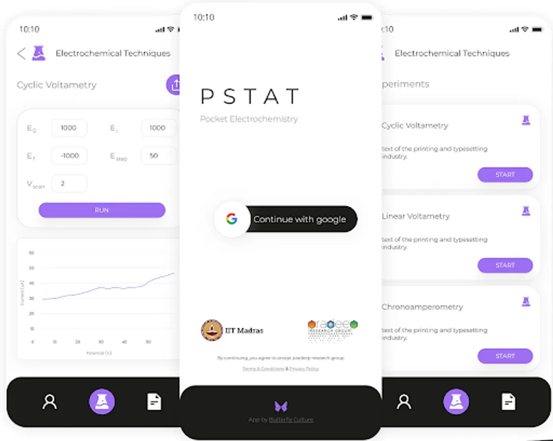 PSTAT is a Bluetooth-based Android app Hand-held Potentiostat. The device is a product by IIT Madras and Pradeep Research Group. The Android app is designed and developed by Butterfly Culture.