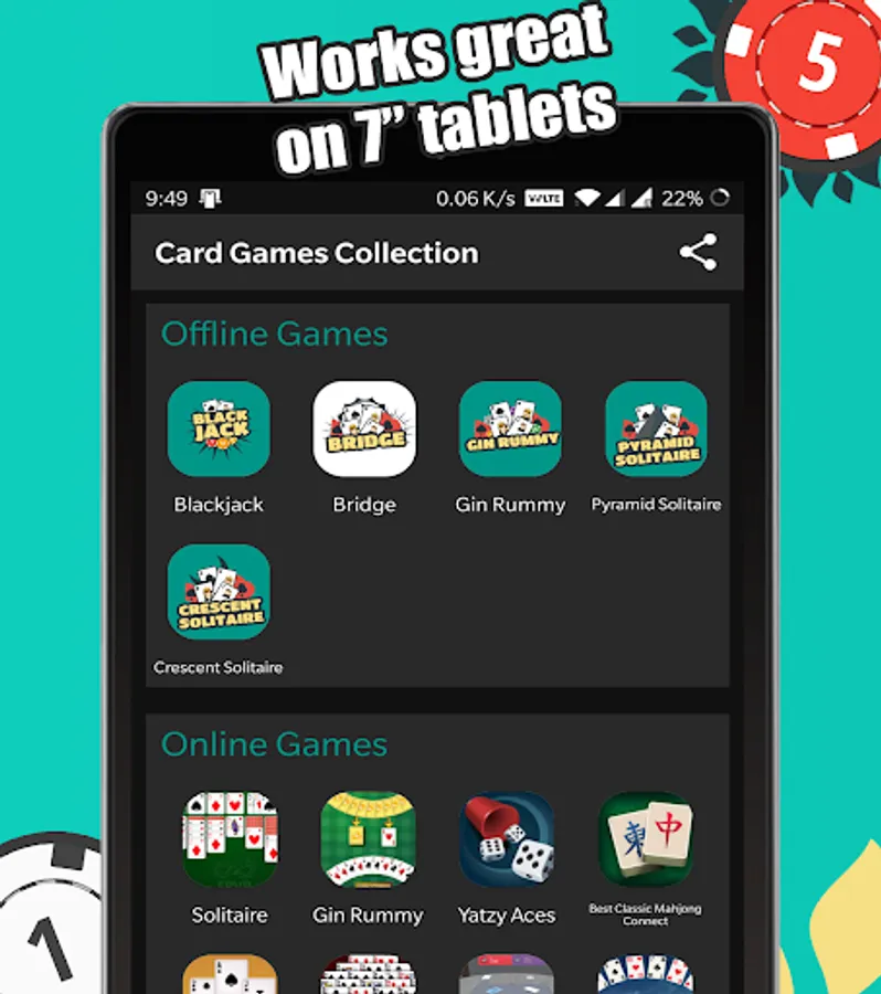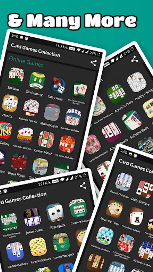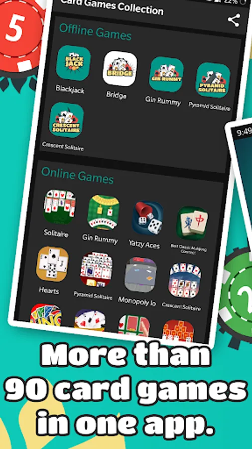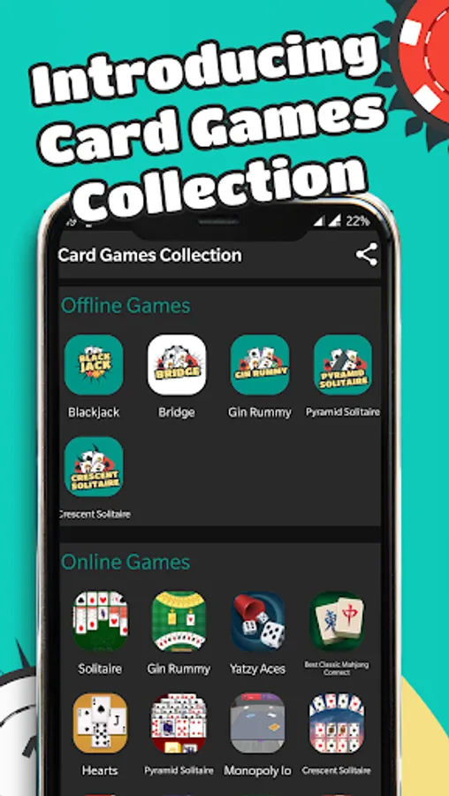 It is collection of both offline card games and online card games. The offline games for free do not need internet or wifi to play while the online card games can only be played if you have internet access via an active mobile network or a wifi connection.
