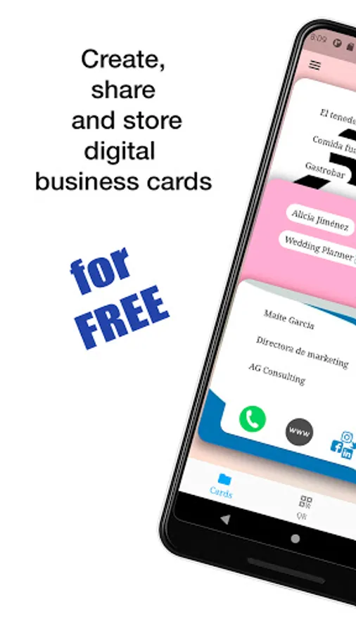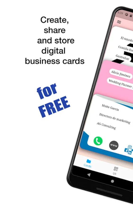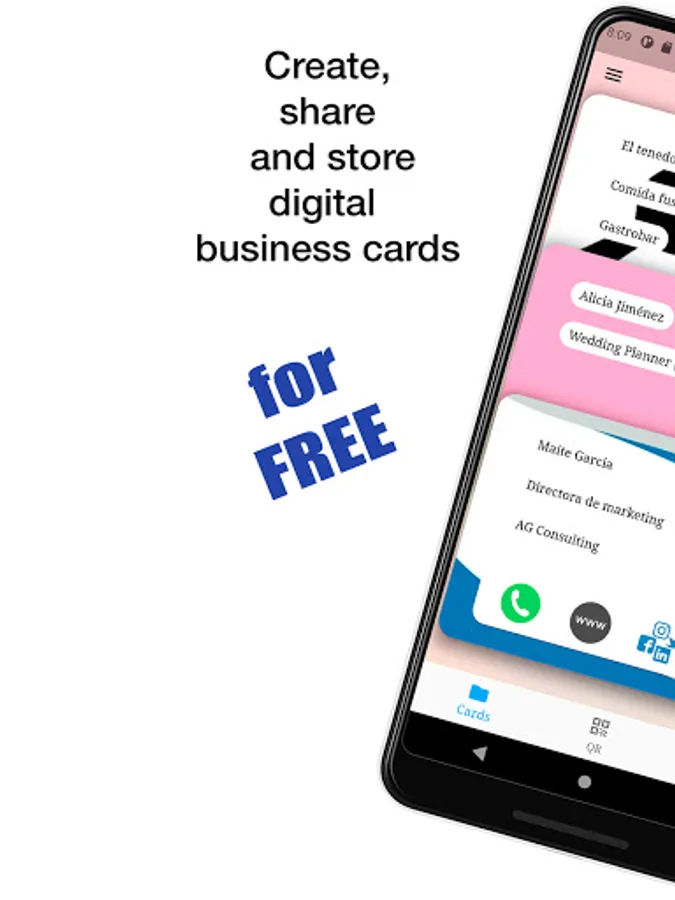 Cards surges as a technological, modern, simple and digital alternative to traditional business cards. We want to make it easy to store and search these cards, but we have already taken the opportunity to digitize their functions! With just one click, now you can write to the lawyer they told you about or call the rural house of that town where you were years ago.