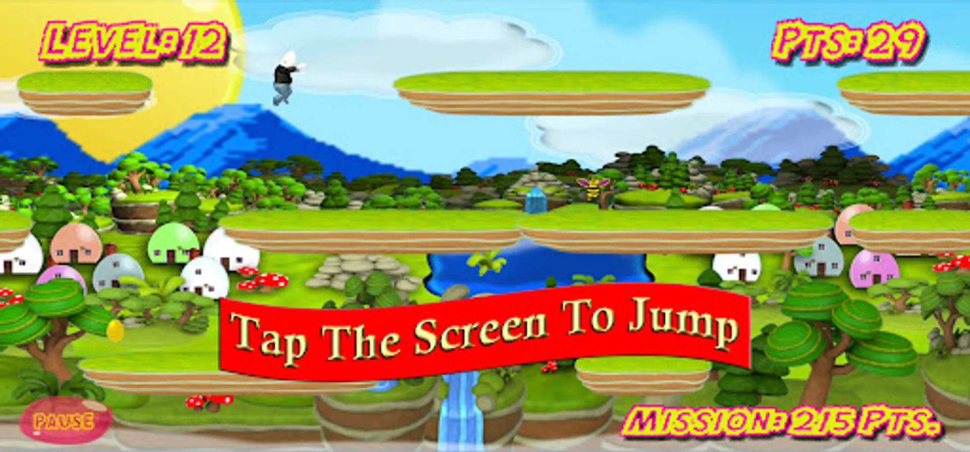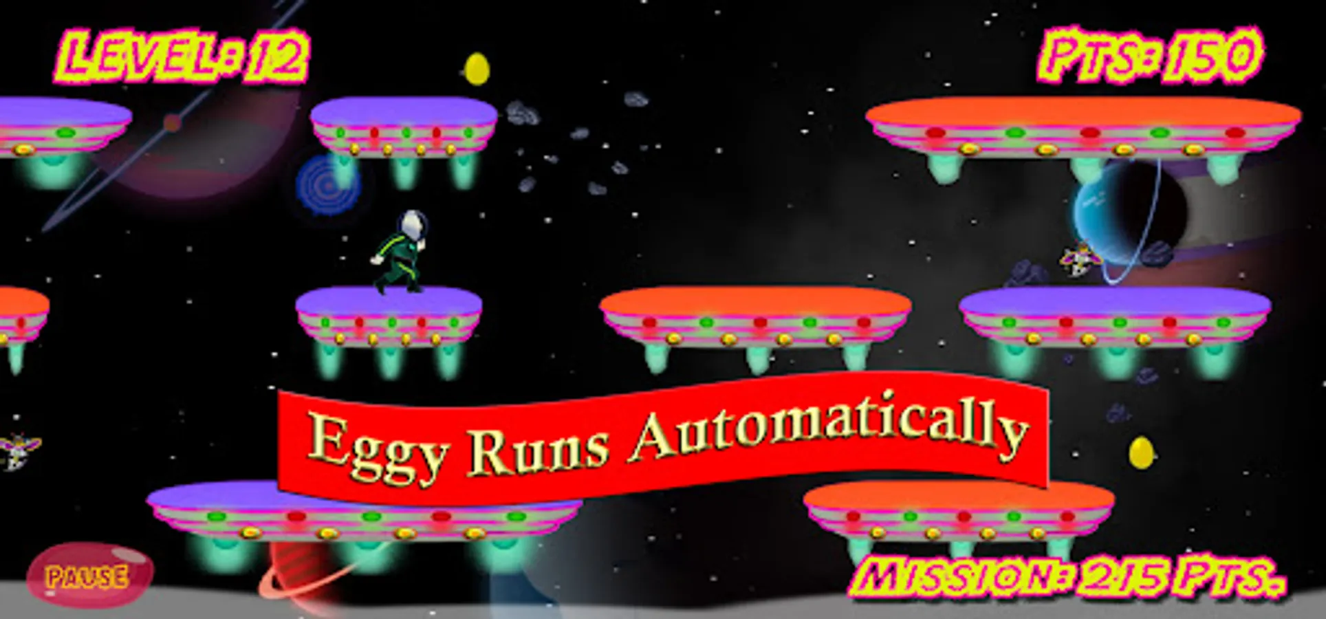 It's very easy, Eggy runs alone and you just have to touch the screen to make Eggye jump. (If when Eggy is in the air you let it go down a little before performing the jump, it will help you not to hit the upper platforms too hard when jumping, if when Eggy is in the air you touch the screen a second time, Eggy will do a second jump in the air (double jump)).
