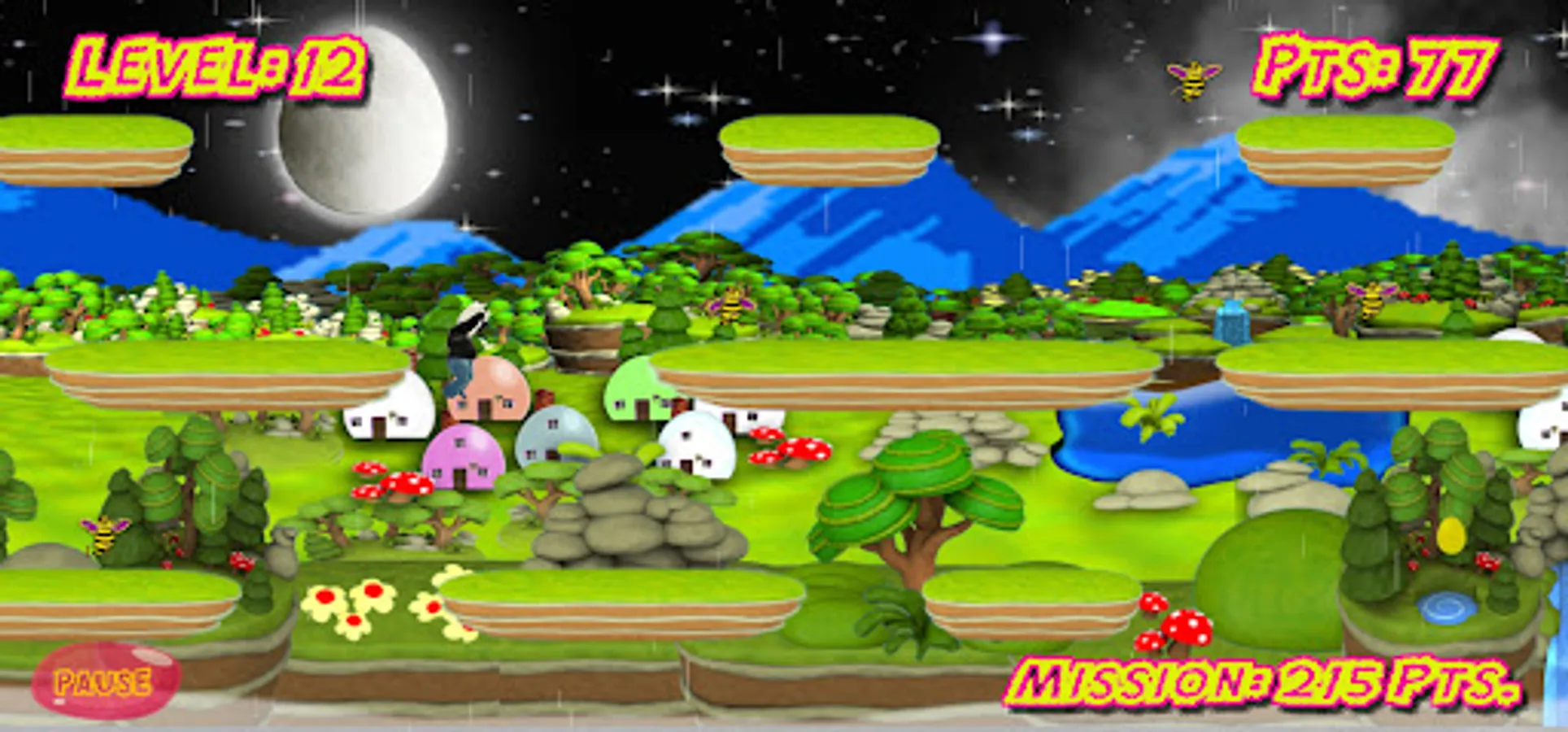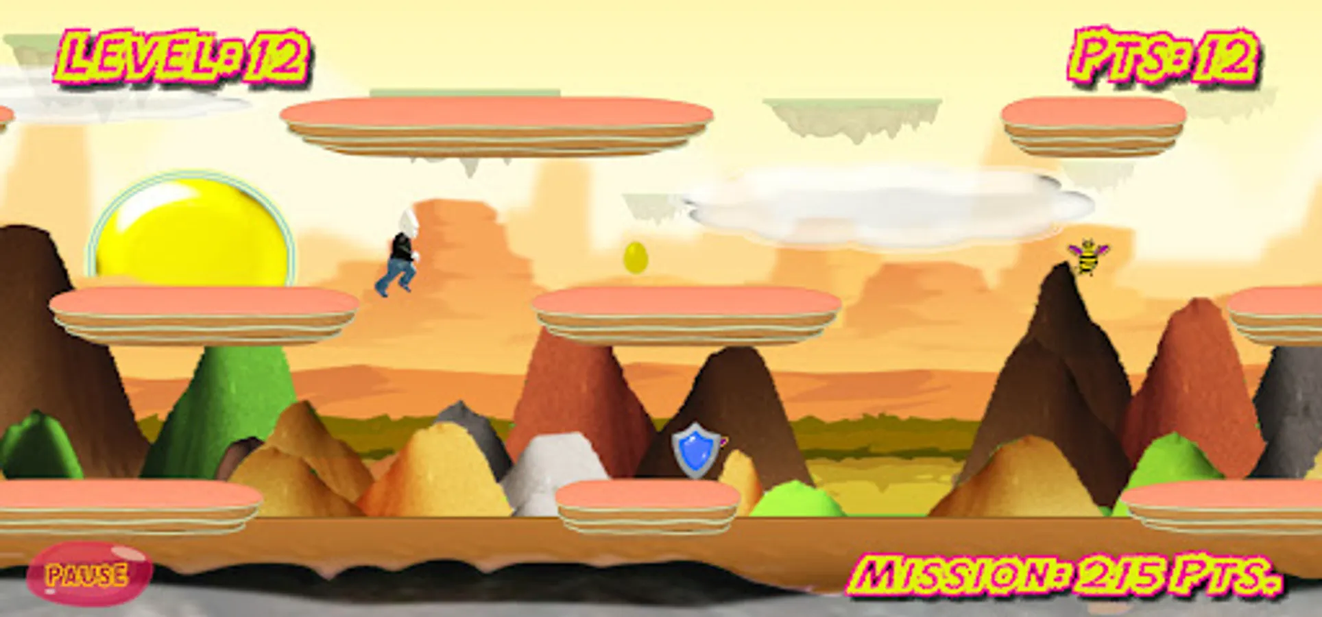 Jump from platform to platform, collecting golden eggs, while trying to dodge the angry bees that will cross you on the way to decrease your points and try to make you fall.