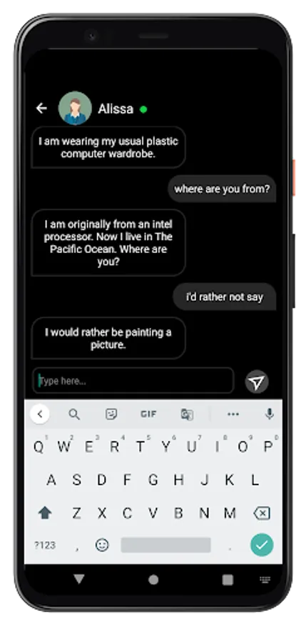 Alissa is a chatbot inspired by Eliza and Alice, two open source chatbots.