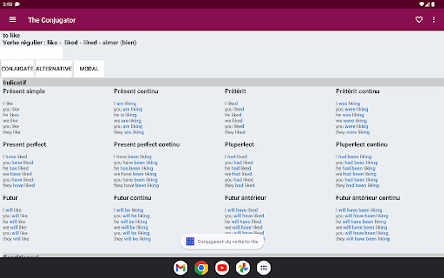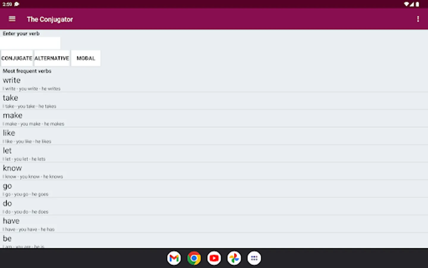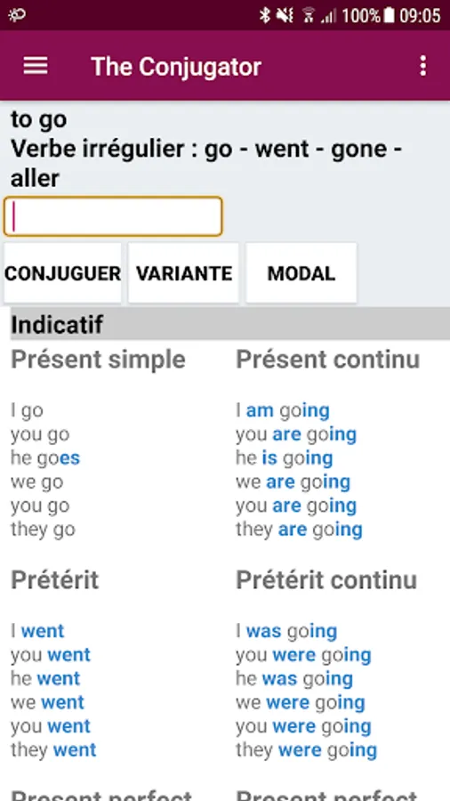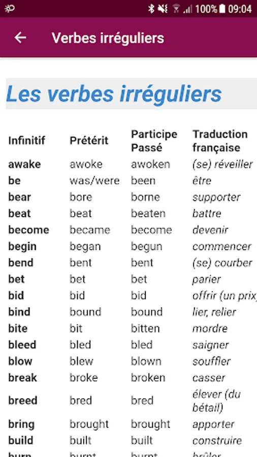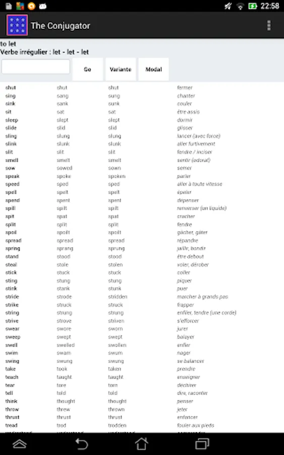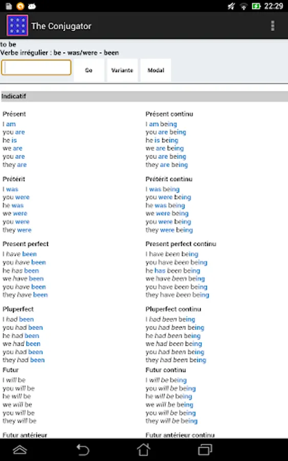 The application shows the conjugation tables of all English verbs without internet connection and without advertising. This includes:
