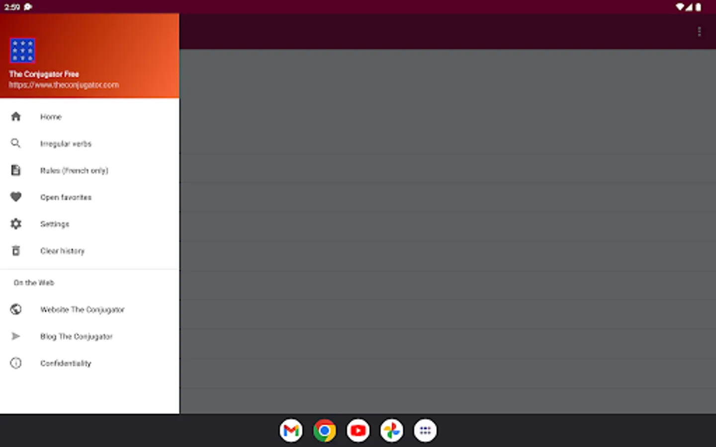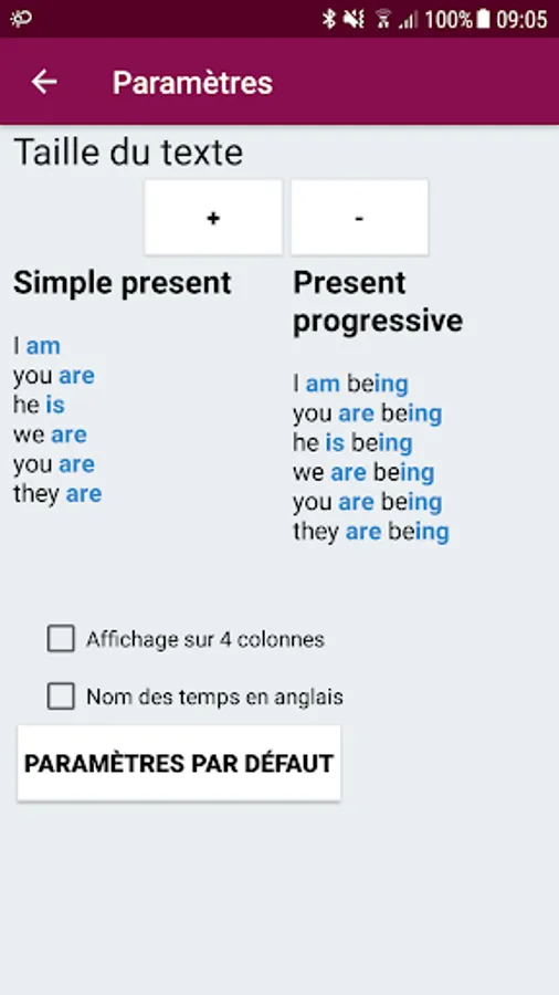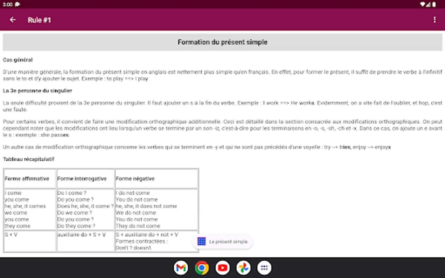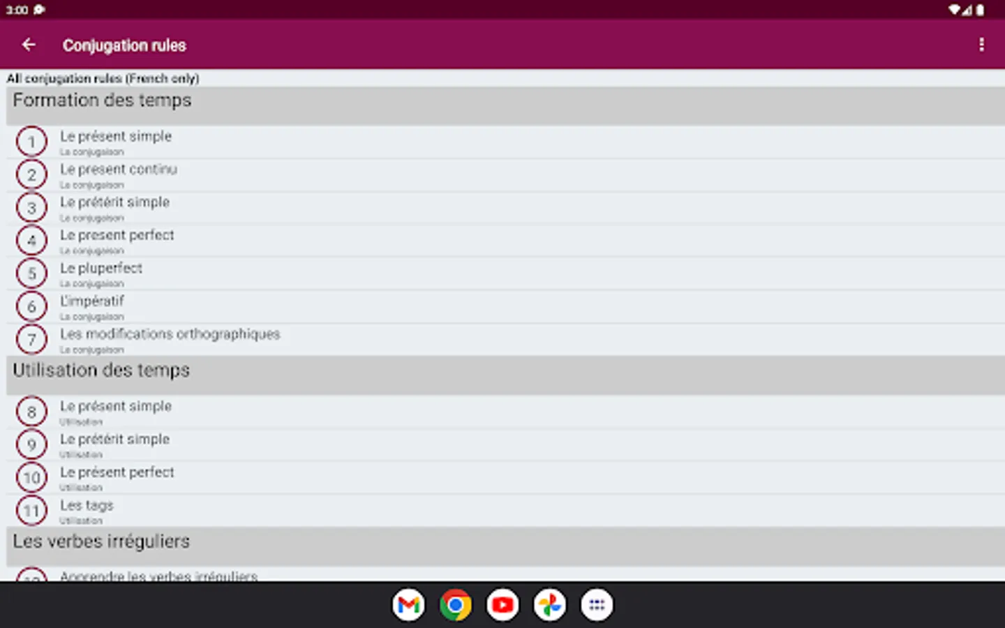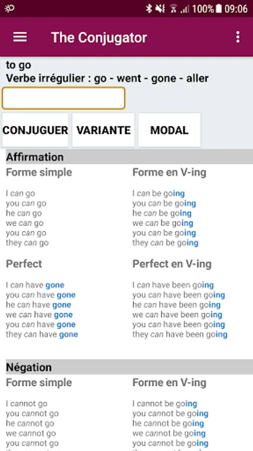 The application shows the conjugation tables of all English verbs without internet connection and without advertising. This includes: