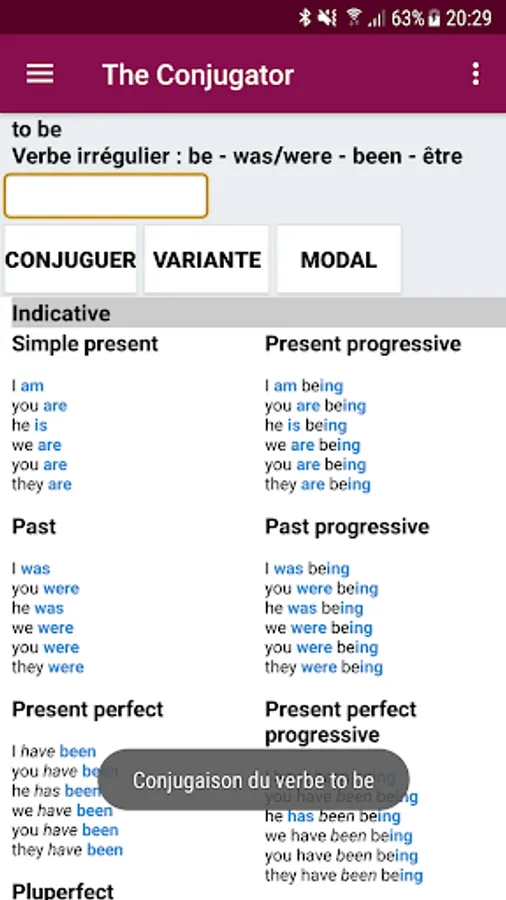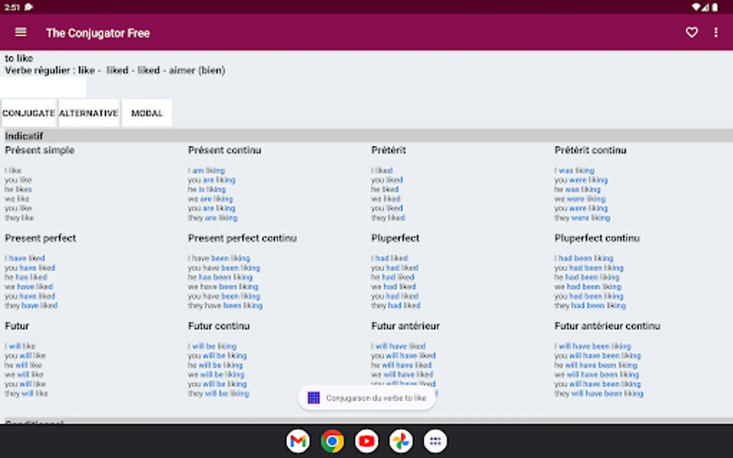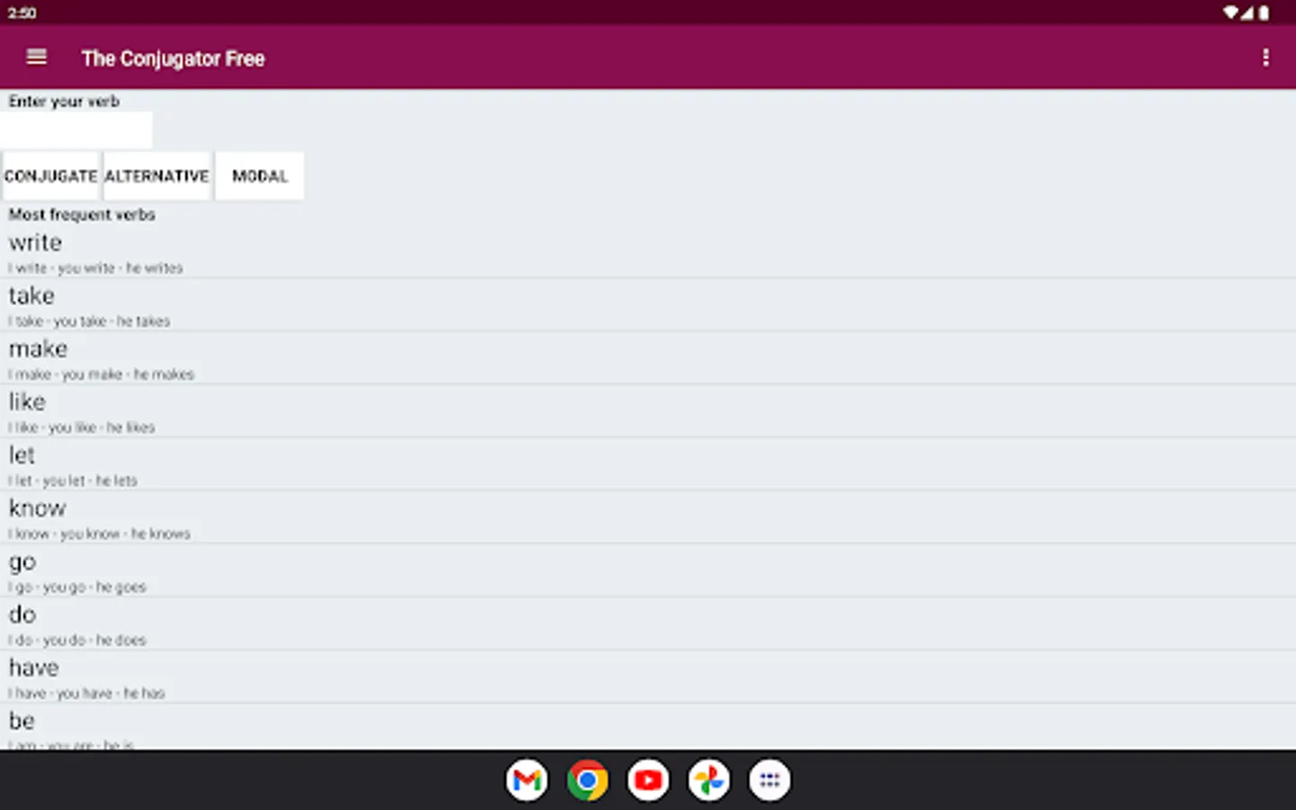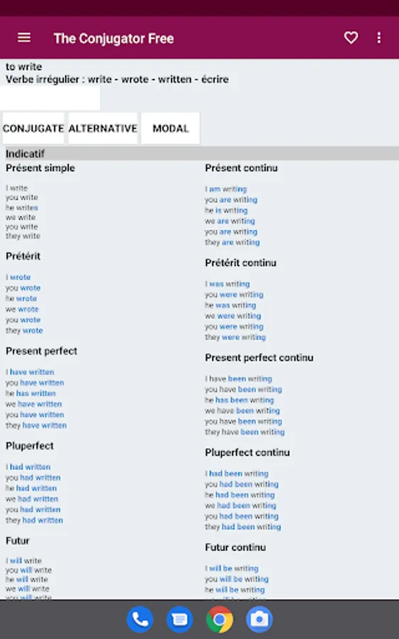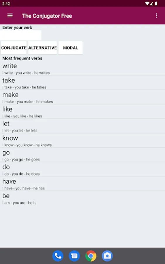 The Conjugator Free allows you to conjugate all English verbs without an Internet connection.