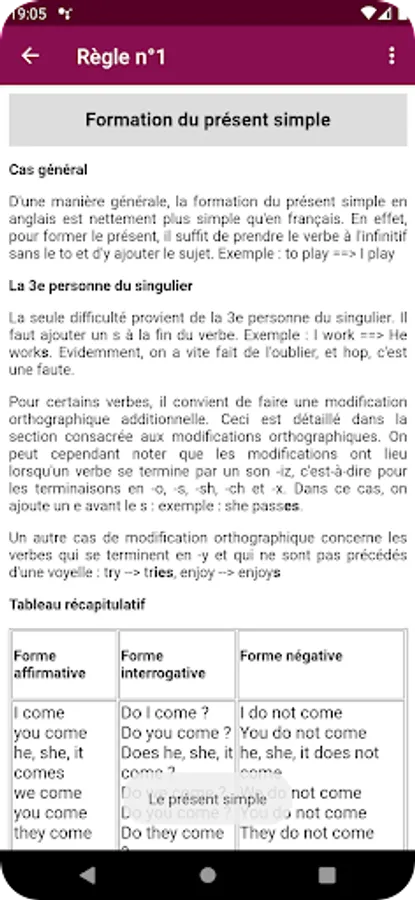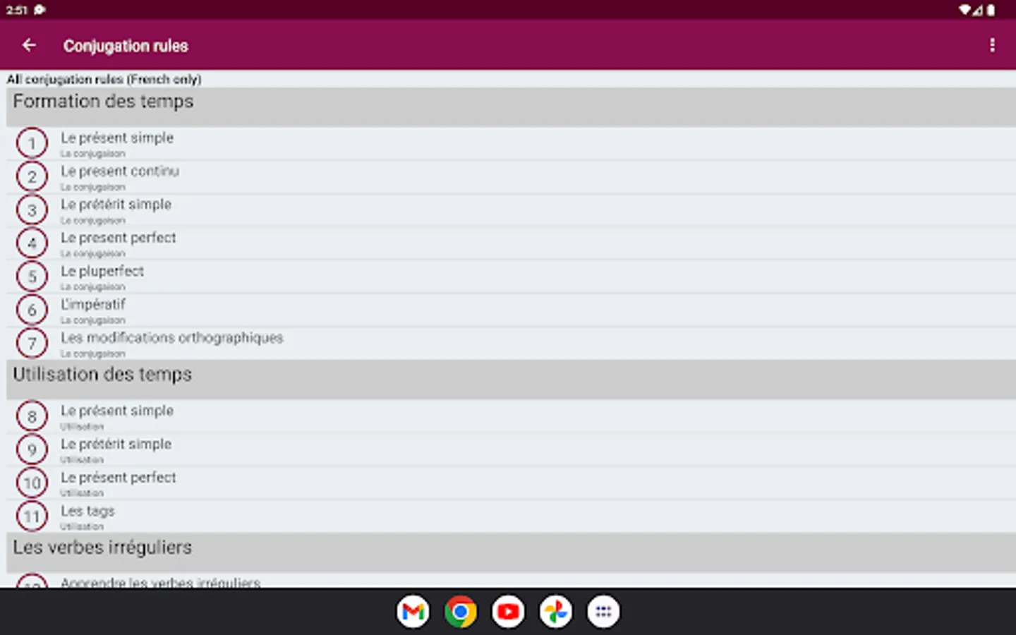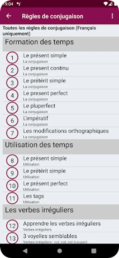 The basic rules of English conjugation are available as well as a list of all irregular verbs.