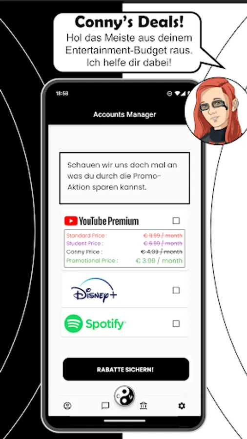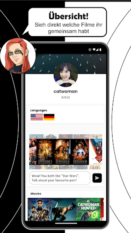 In the Conny app you will always find people to discuss about movies or series. Become part of the Conny community and exchange ideas about your favorite movies. In the Connyversum you have unlimited contact to other people. All messages are encrypted end to end to protect your privacy. On top of that Conny has great deals for entertainment providers so you can access as much entertainment as possible on your budget!