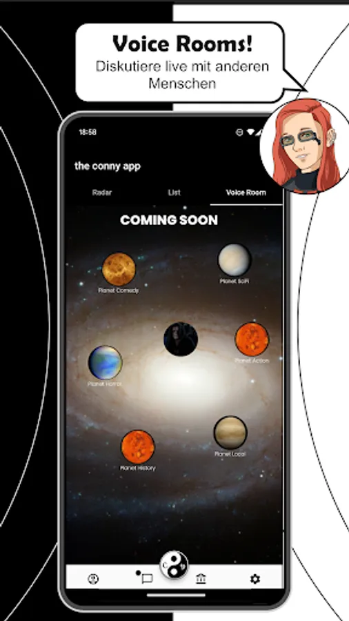 Conny brings you Voice Rooms where you can discuss your fan theories, the latest episode of a show, or the episode that ended 5 minutes ago to your heart's content. Connect with many people at once in the Voice Rooms. With the Voice Rooms, some mini-games also become available and you can conquer the leaderboards.