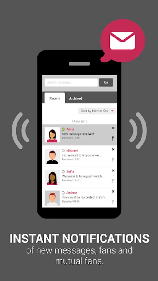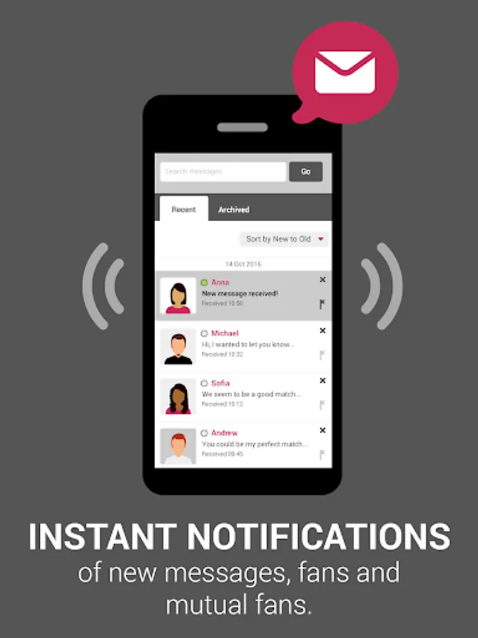• INSTANT NOTIFICATIONS of new messages, fans and mutual fans.