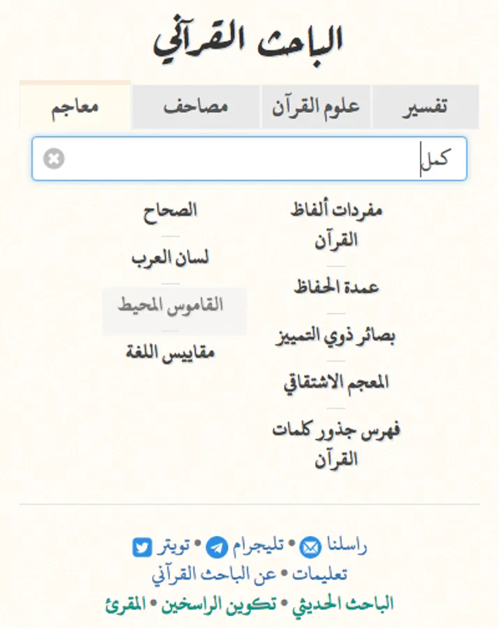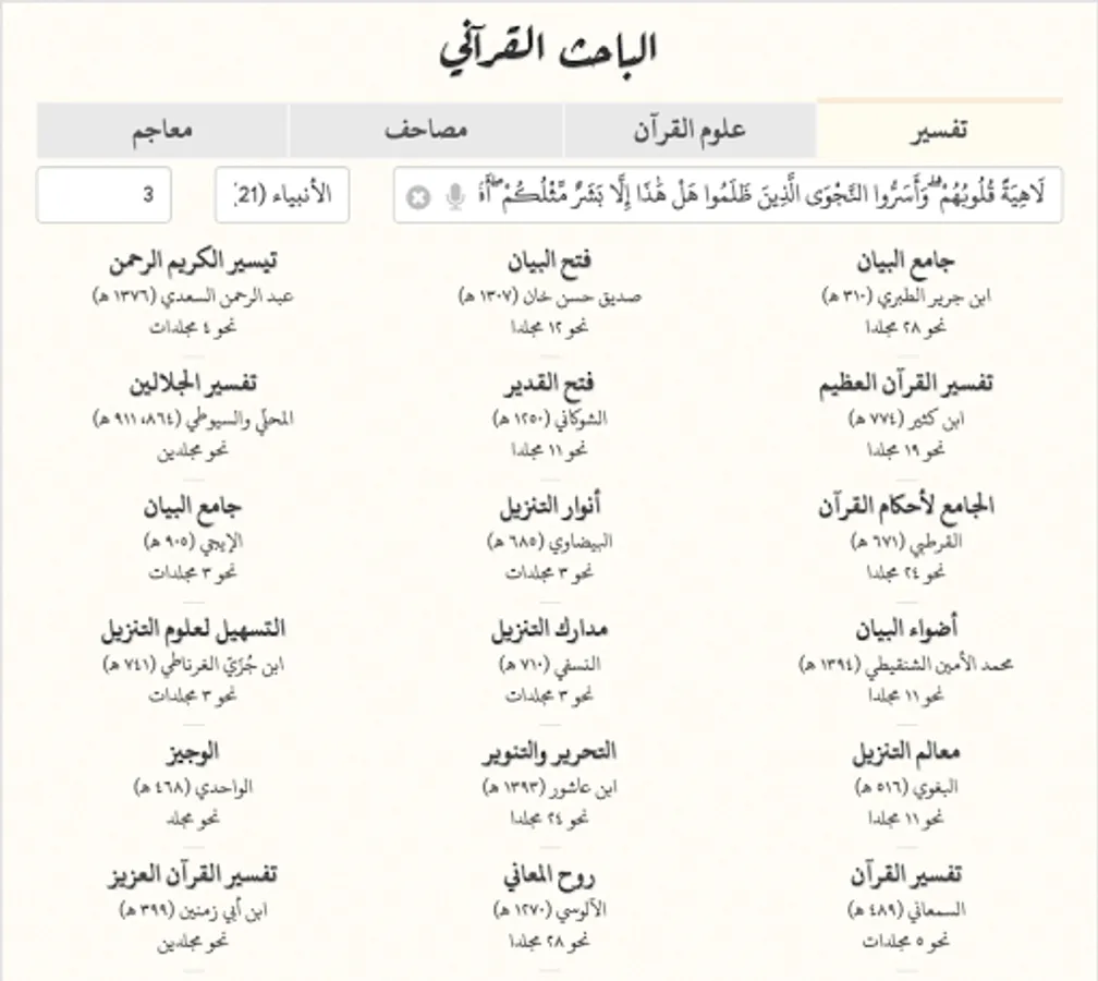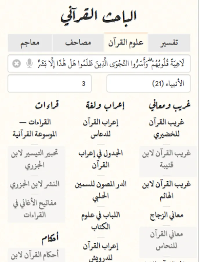 Explanations (tafsir/exegesis) • Sciences of the Qur'an • Qiraa'aat • Iraab (grammar) • Sarf (morphology) • Reasons of revelation • Ahkaam • Quranic lexicons