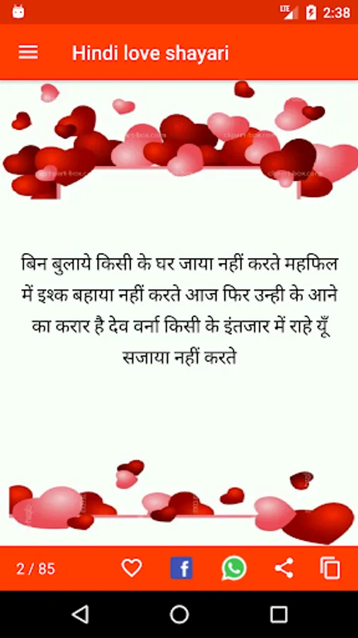 It also has Hindi Sms, Shayri In Hindi with collections from Sher Shayari, Romantic Shayari On Love, you can also enjoy Hindi Me Shayari or Shayari Hindi Mai. It is store for Best Love Shayari, Sad Sms In Hindi and New Hindi Shayari.