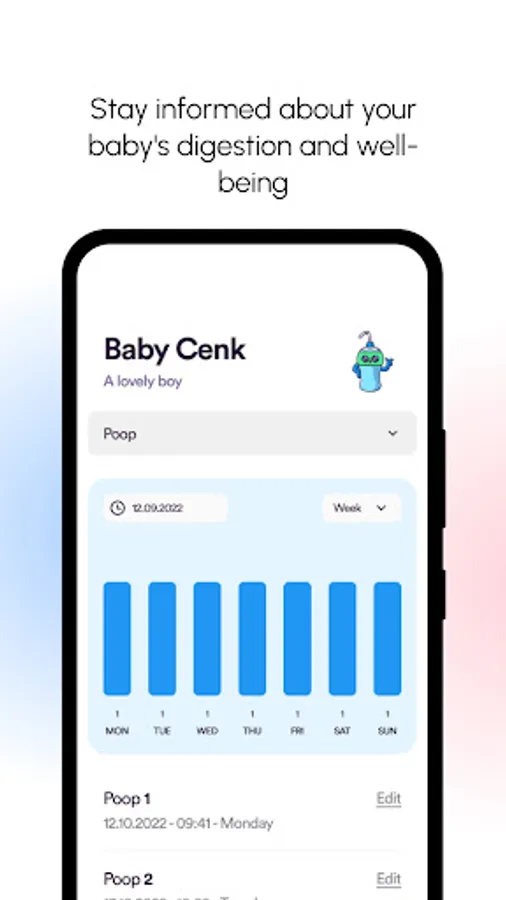 * Easy-to-use diaper changing tracker for monitoring your baby's digestive health