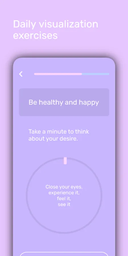 The app will help you to visualize your desires and help you to solve inner blockages in just a few minutes - just use the 1-minute visualization exercises.