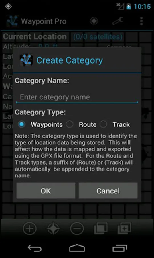 Waypoint allows you to easily organize your location data by creating categories which specify the type of location data being stored. Three types of location data are supported, Waypoints, Routes, and Tracks. The type of location data choosen for each category will determine how the data is mapped and exported using the export to GPX feature.