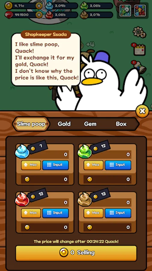 Be careful, though, because "Ssada" changes the price tag of the slime poop for each attribute every time! You'll want to sell the most expensive slime poop first!