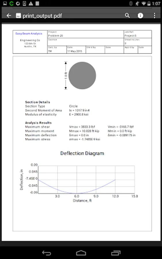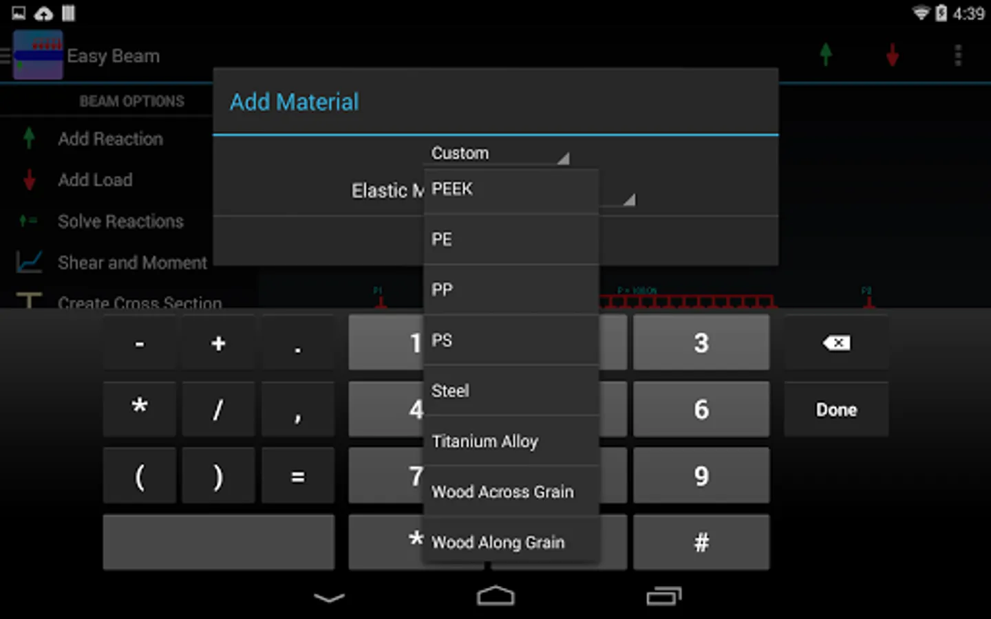 Easy Beam also takes care of the units for you and does conversions on the spot. It also has the elastic modulus of many common materials stored for convenience. Easy beam also calculates area moment of inertia for you whether you have a rectangular, circular, hollow, or I-Beam cross section. Or just input your custom area moment of inertia.