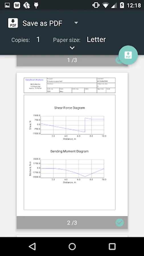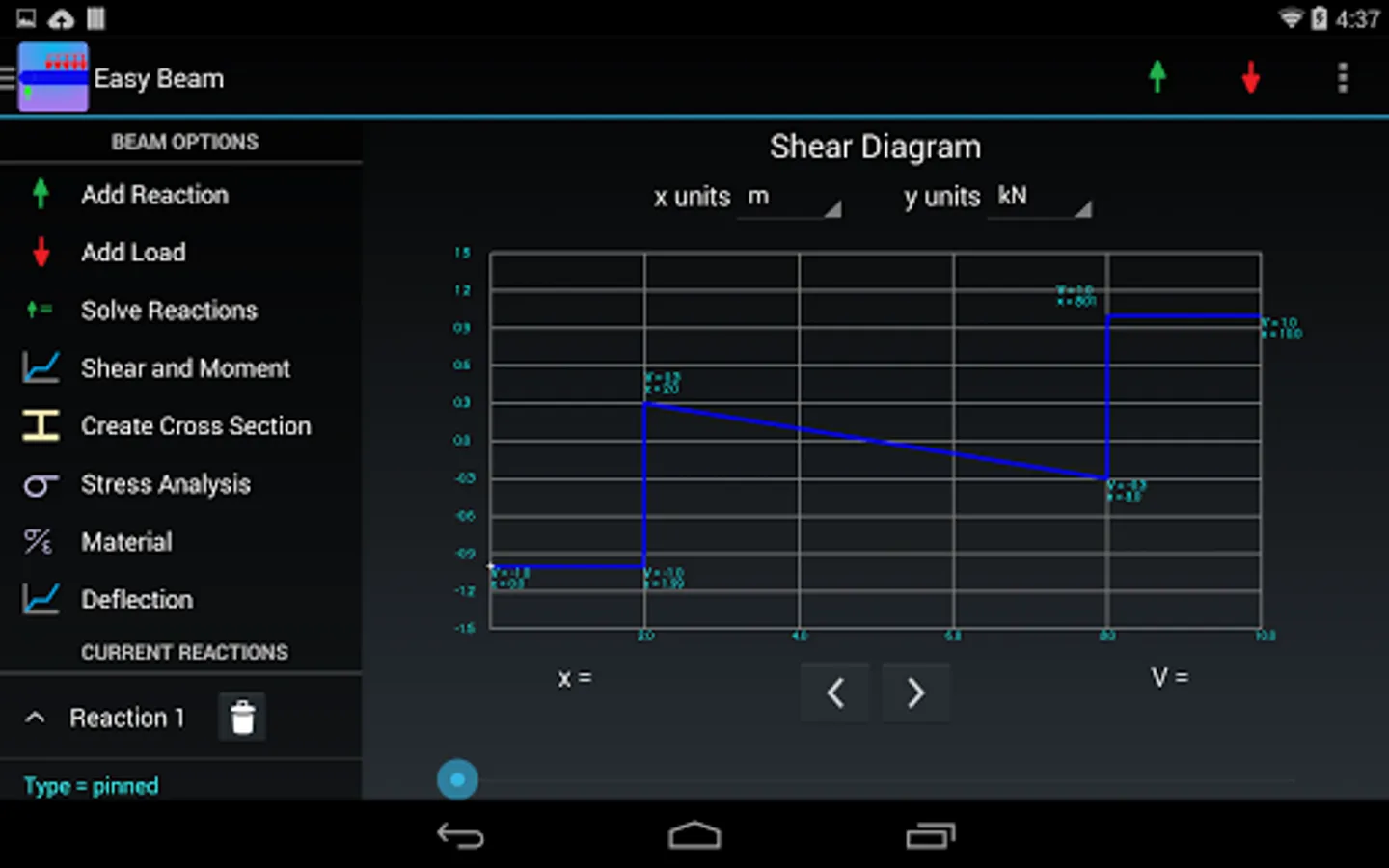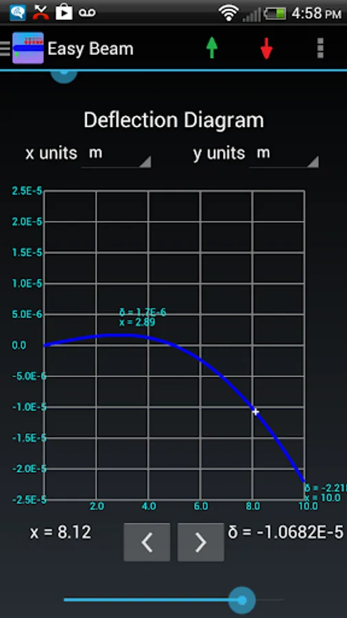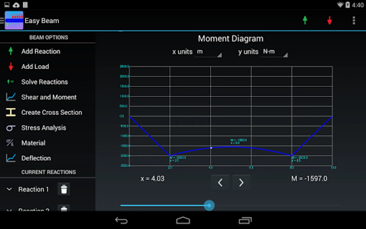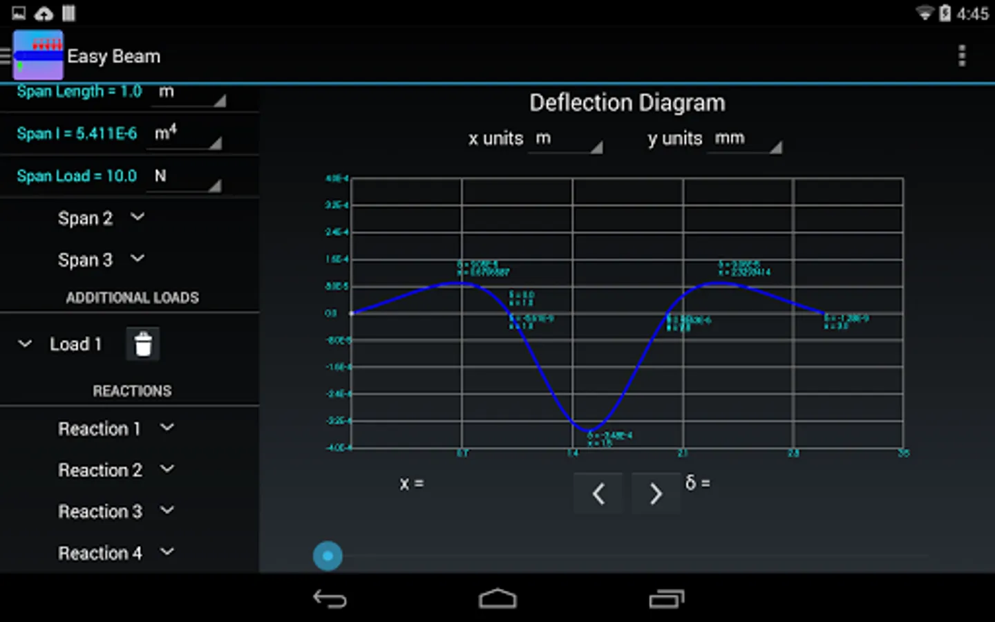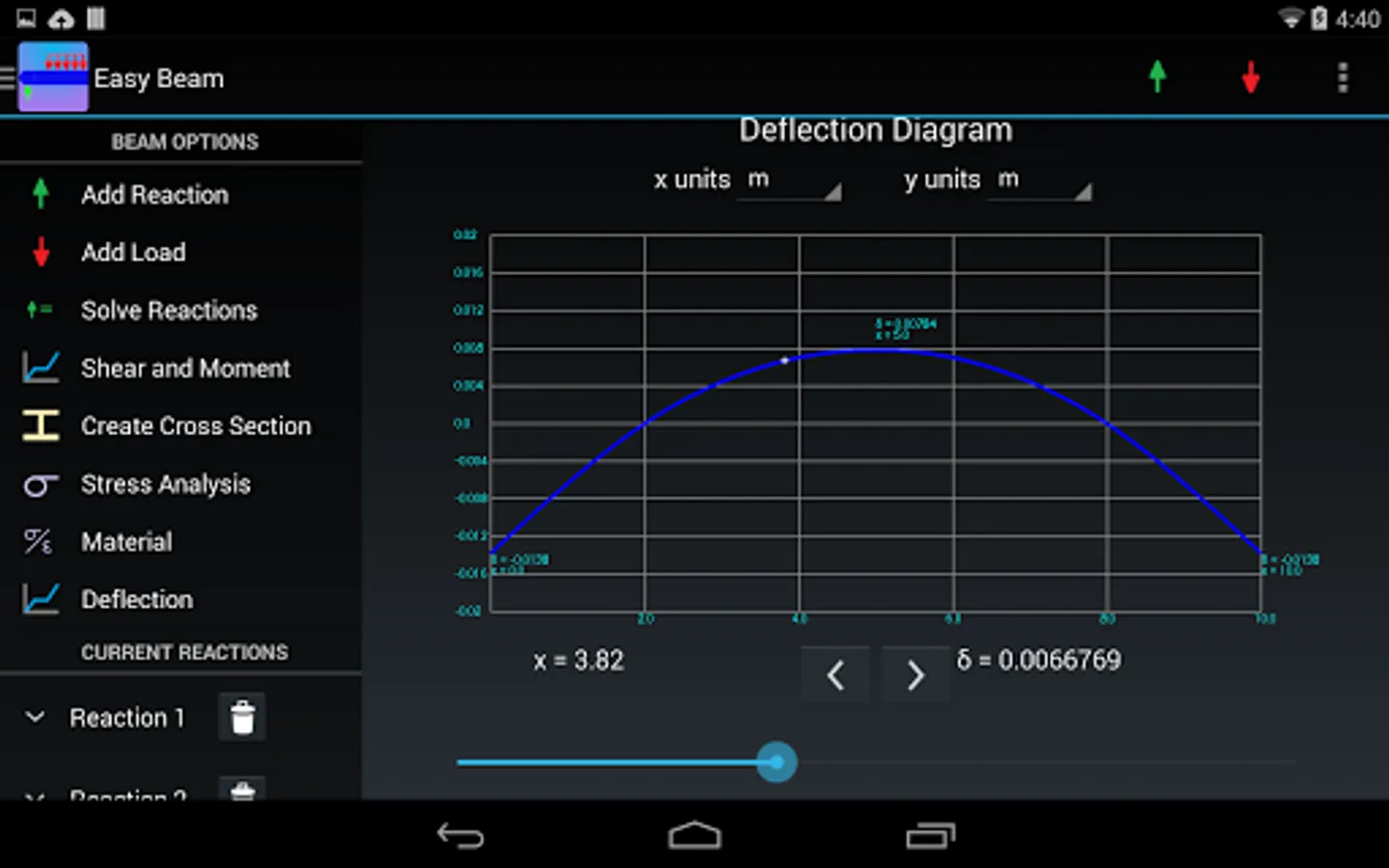 Interactive graphs allow the user to pinpoint shear force and bending moment anywhere on the beam or determine where the max deflection will occur in their beam design. That's because Easy Beam's graph allow the user to use a seek bar to move a cursor along the graphs. By default, the graphs also display local min and max values on the screen for your convenience.
