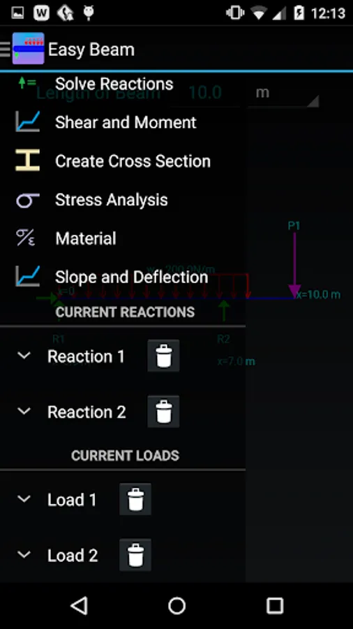 In the Statically Determinate section you are able to put point loads, distributed loads, triangle distributed loads, and moments anywhere on the beam. Essentially you can customize it however you like provided it is statically determinate. You can now draw out shear forces and bending moment diagrams. Create a cross section and you can do a bending stress analysis on the beam. Test your beam design by entering a material or a custom elastic modulus and you can see the deflection graph for the beam. At any time you can see your current loads on the main menu.
