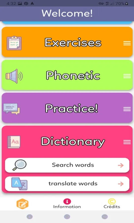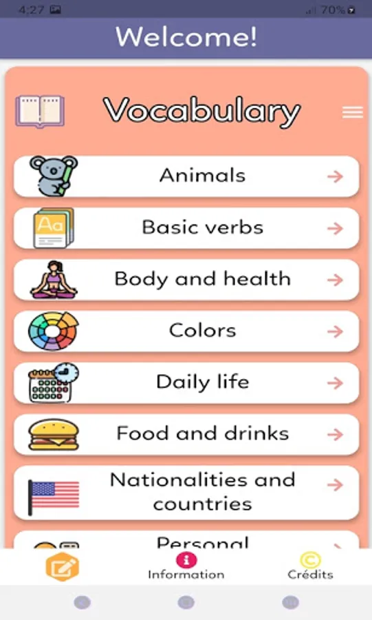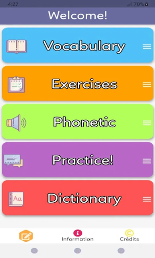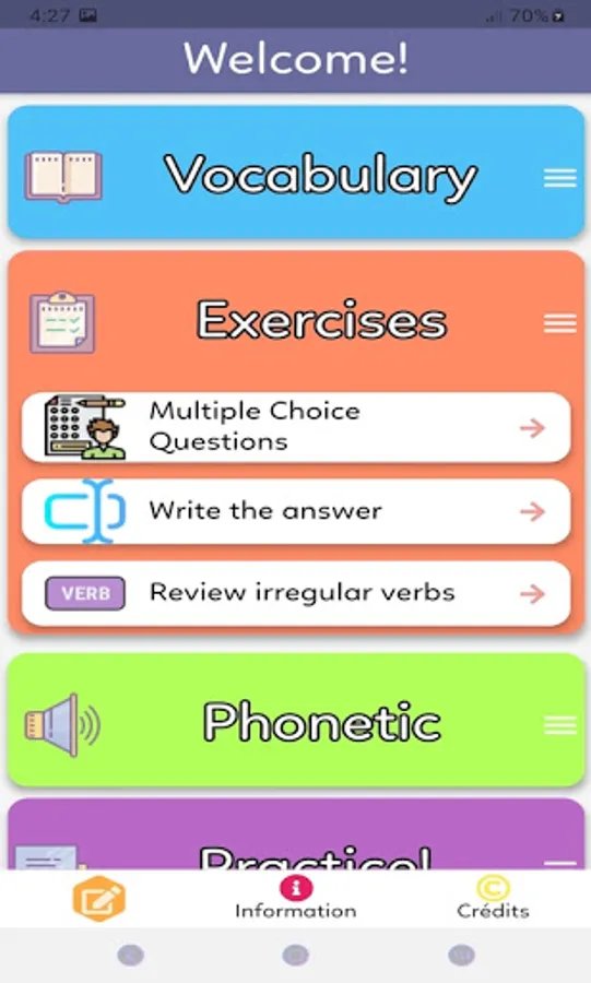 Although it can be used on its own, this application complements the book "Piece of Cake Grammar of American English", published by Éditions Ellipses. It allows learning English in a fun way. The application and the book are intended for beginners, equivalent to level A1 of the CEFR scale. This application contains all the English vocabulary required for level A1. It also allows you to review your irregular verbs at level A1. It includes mini vocabulary and grammar review games as well as a chatbot system to train you to communicate. You will also find a unilingual dictionary and an English-French / French-English translator.