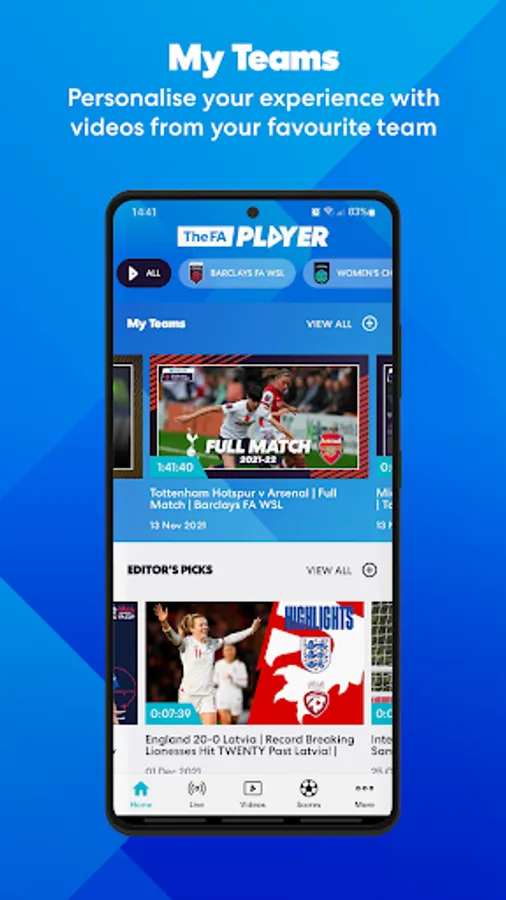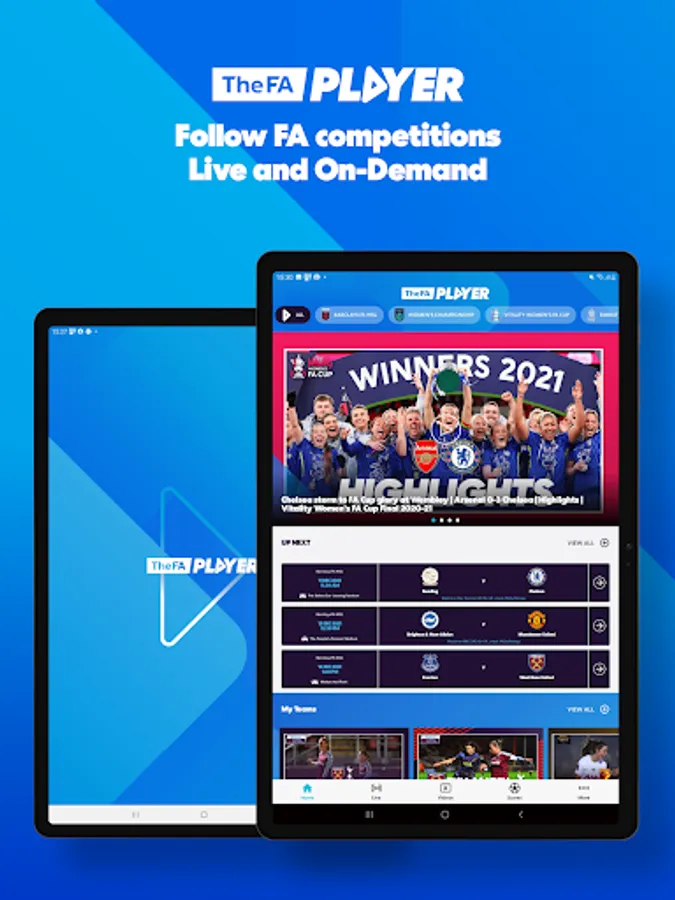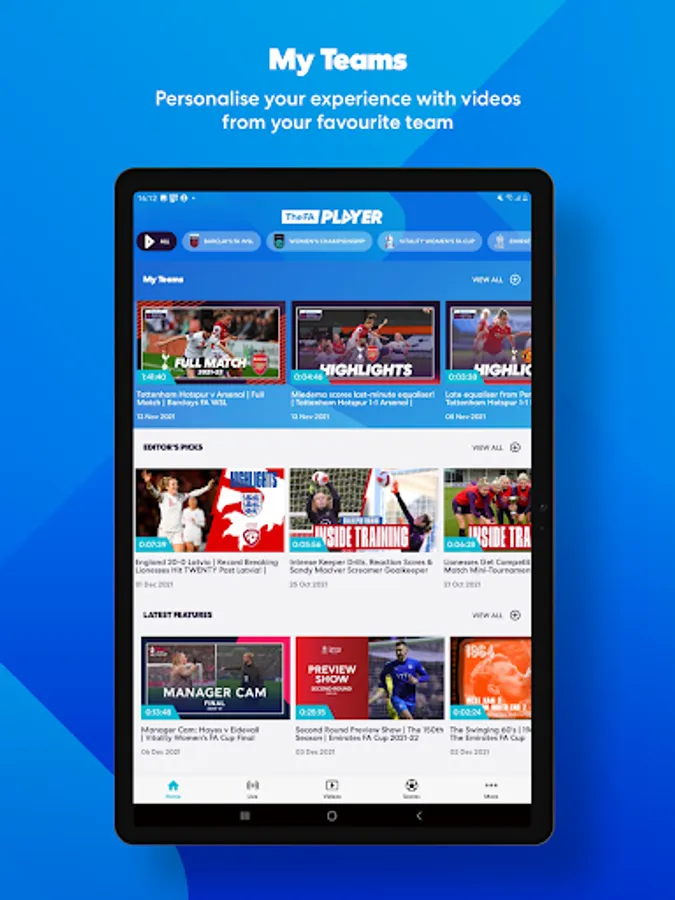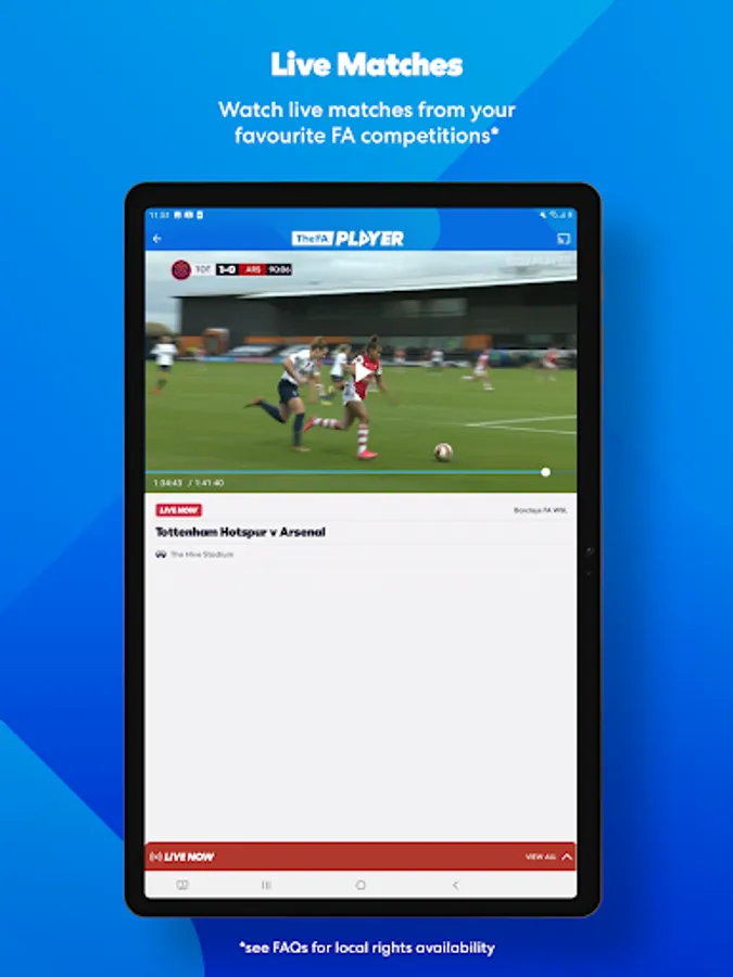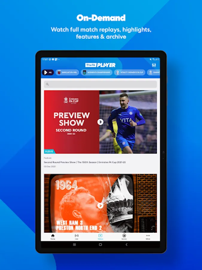 selected live matches as well as full match replays, highlights and features from England’s Lionesses, Vitality Women’s FA Cup, Emirates FA Cup and The FA Women’s Continental Tyres League Cup.*