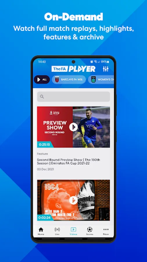 The FA Player - watch live football across The FA competitions, covering the Barclays WSL, Barclays Women’s Championship, Vitality Women’s FA Cup, Emirates FA Cup, FA Women’s Continental Tyres League Cup and England’s Lionesses.