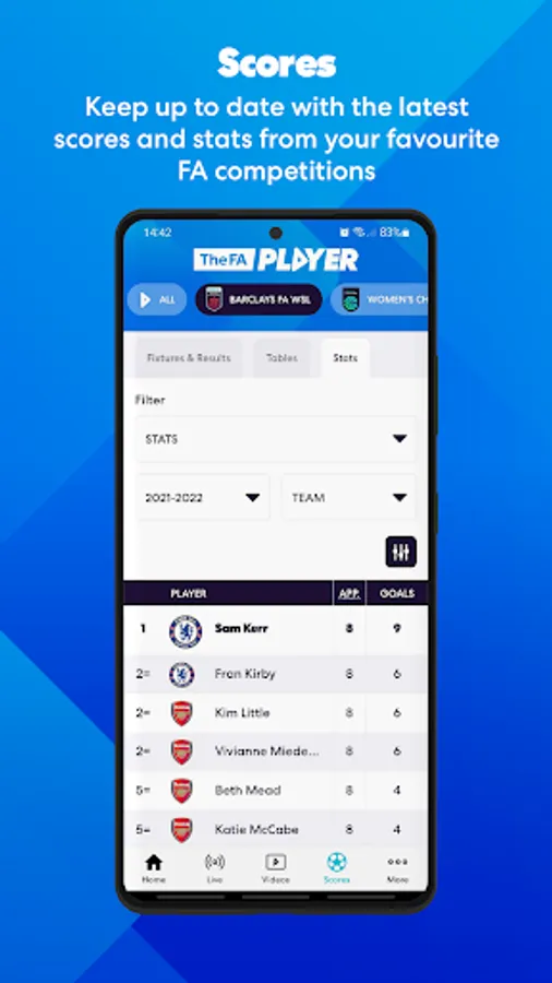 Follow your favourite Barclays WSL or Barclays Women’s Championship team in the dedicated My Teams section.