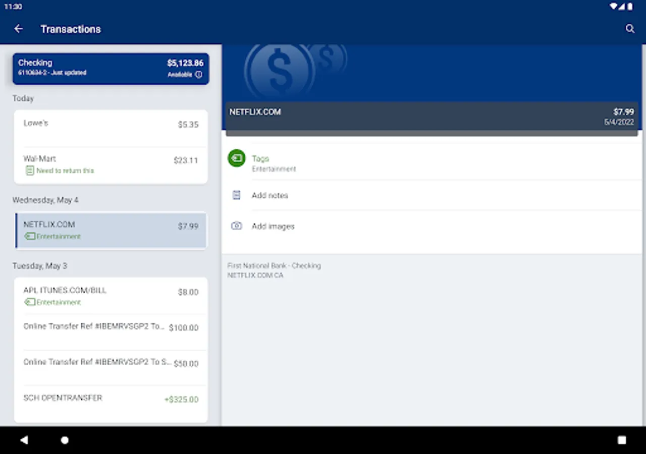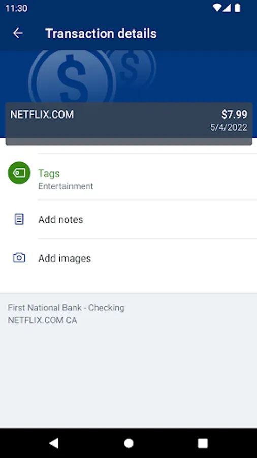 • Keep your transaction organized by adding tags, notes, and photos of receipts and checks.