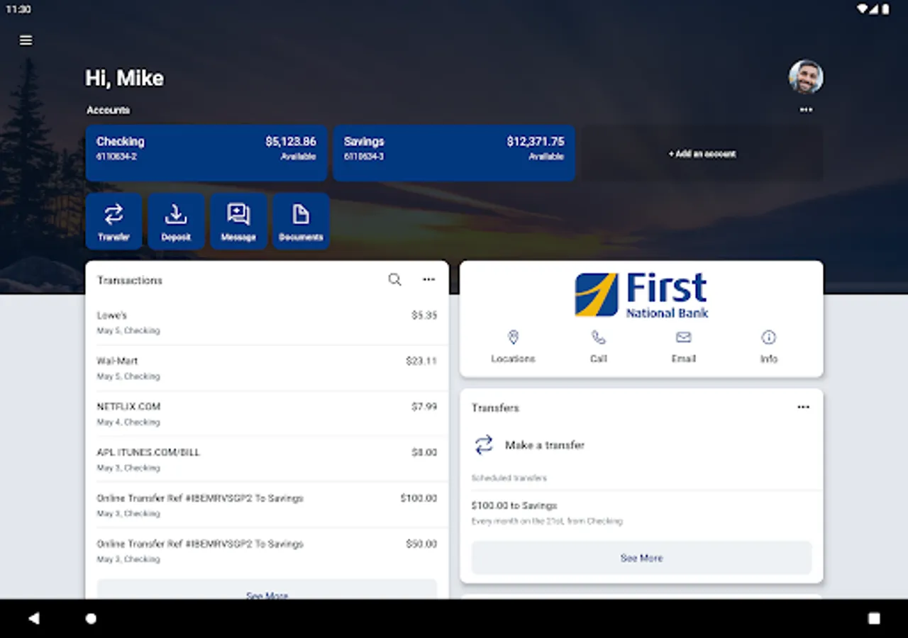First National Bank is a free mobile app that provides customer access to their accounts from anywhere, at any time. It’s fast, secure and makes life easier by empowering you with the tools to manage your finances.