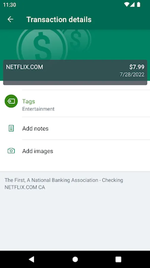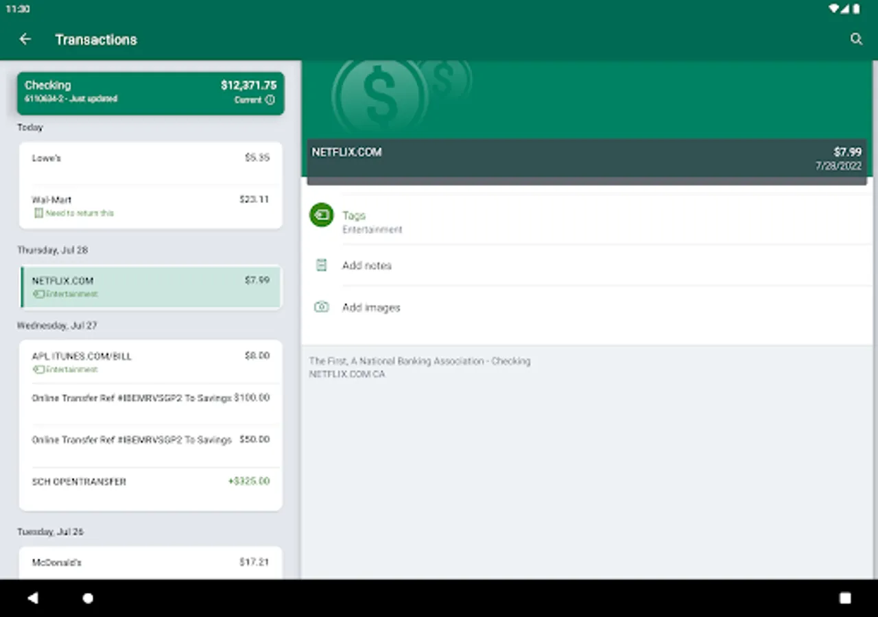 Add Tags, Notes, Images & Geo-Information: By enhancing transactions with custom tags, notes or photos of a receipt or check, you have the ability to stay organized and find exactly what you’re looking for when searching through your finances.