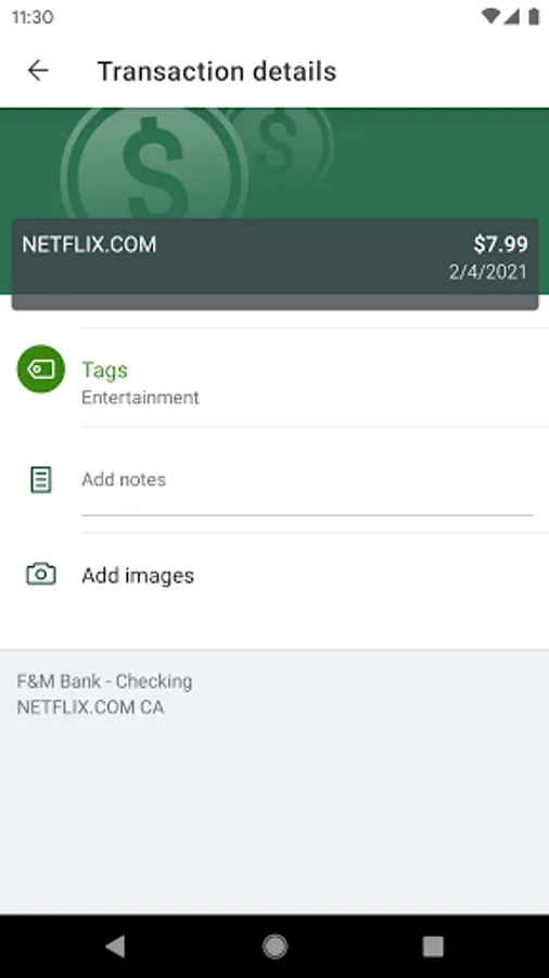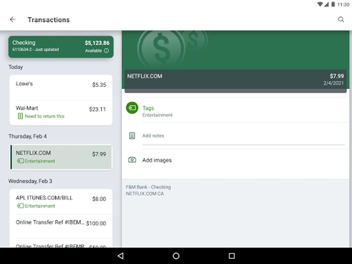 Add Tags, Notes, Images & Geo-Information: By enhancing transactions with custom tags, notes or photos of a receipt or check, you have the ability to stay organized and find exactly what you’re looking for when searching through your finances.