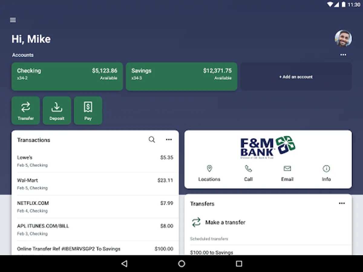 The F&M Bank Mobile App is a free mobile decision-support tool that gives you the ability to aggregate all of your financial accounts, including accounts from other financial institutions, into a single, up-to-the-minute view so you can stay organized and make smarter financial decisions. It is fast, secure and makes life easier by empowering you with the tools you need to manage your personal finances.