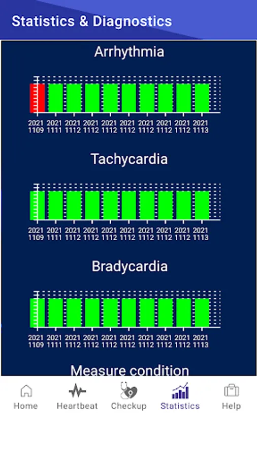 Secondely under "in app purchase", Heart dysrhythmias app can analyze you heart rythme and can detect in some cases, arrhythmia, tachycardia or bradycardia. The measure condition diagram is the most important to check. You should not take into account a result when the measure condition is red.