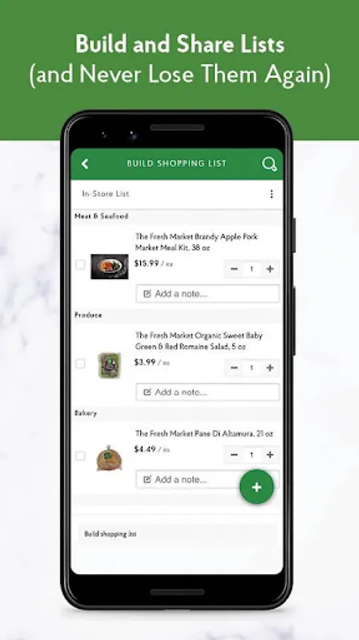 Discover all your favorite foods, all in one place! Browse your local store’s items, from exceptional meat and seafood to seasonal produce, easy meals and entertaining essentials. Build shopping lists, check out weekly specials and more. You’ll never shop The Fresh Market the same way again!