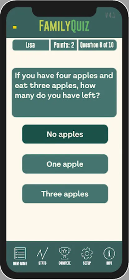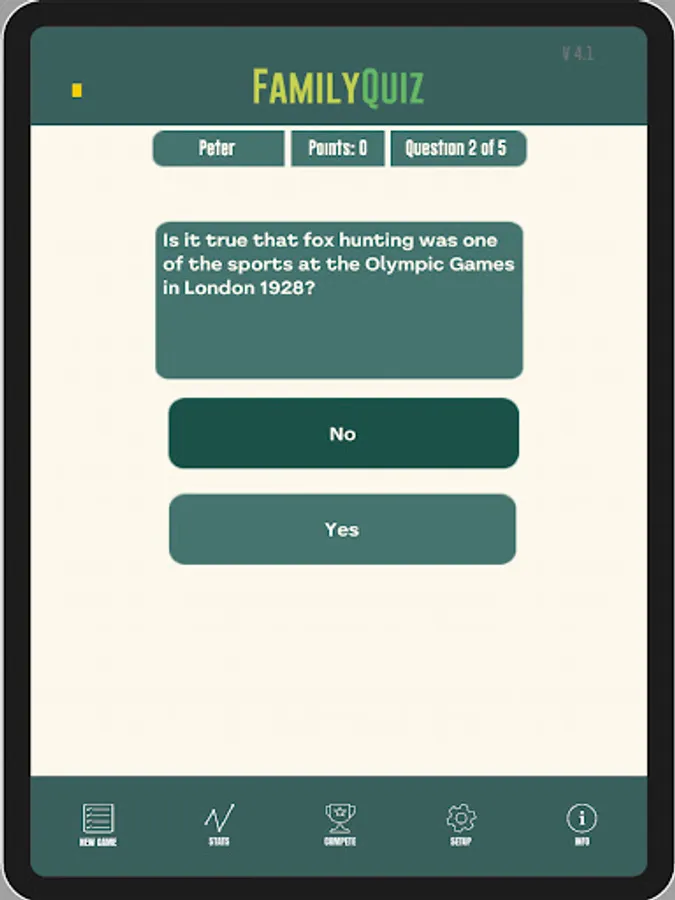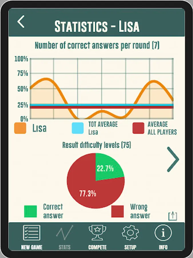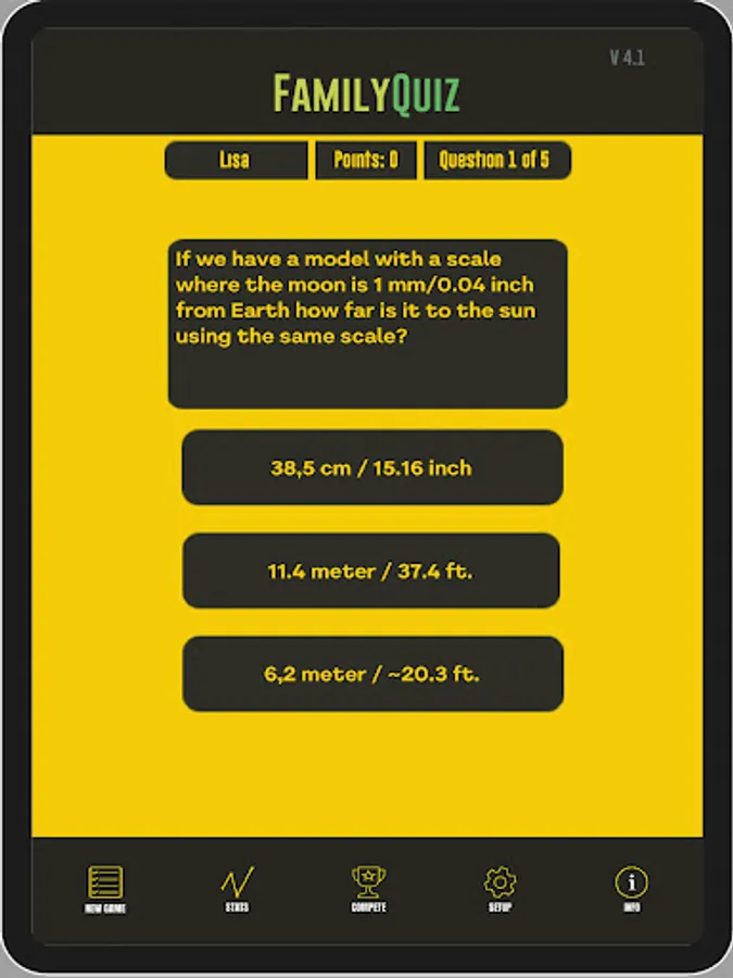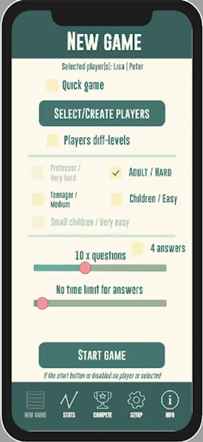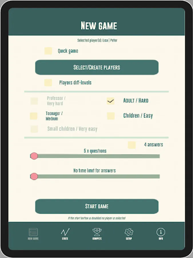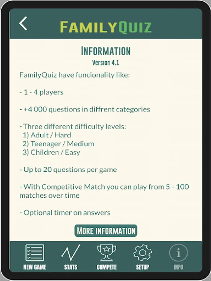 Play a quiz with family and friends with the opportunity to play adult against children with questions of varying difficulty. The game has the following difficulty levels that are adapted to different difficulty levels:
