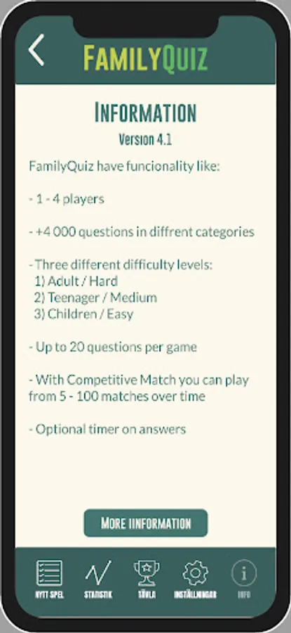 With FamiljeQuiz you get over 7 800 questions in different levels of difficulty with the opportunity to play up to four players. Choose if you want up to three or four answer options with or without a time limit for answering.