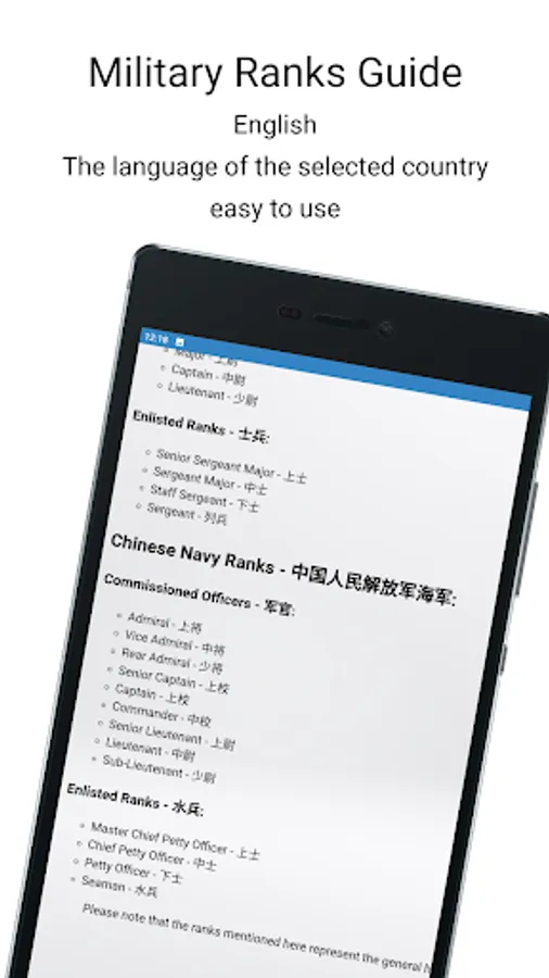China: The People's Liberation Army (PLA) of China employs a rank structure that includes General, Lieutenant General, Major General, Senior Colonel, Colonel, Lieutenant Colonel, Major, Captain, Senior Lieutenant, and Lieutenant for officers. Enlisted ranks include Sergeant Major, Sergeant, and Corporal.