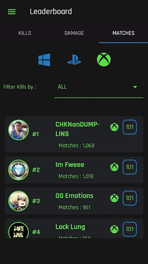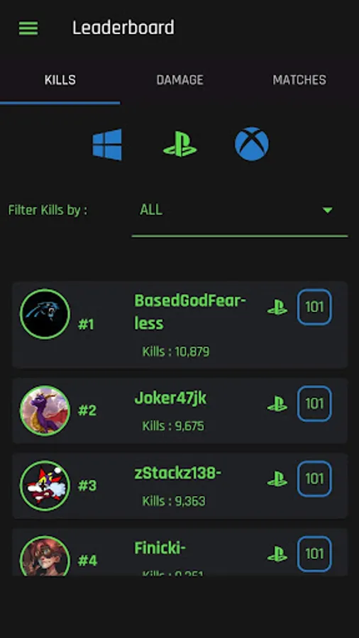 Leader-boards for kills, matches and damage for all platforms
