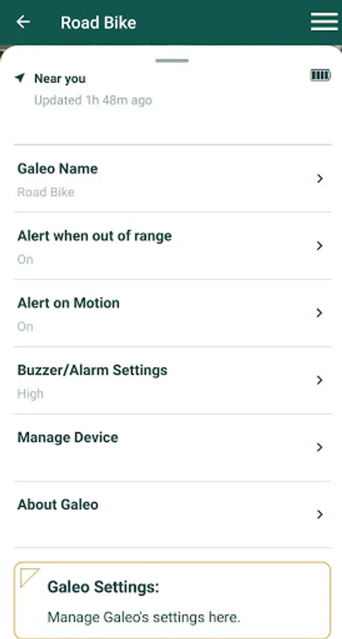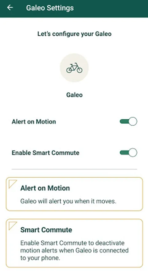 Every year over 2 million bikes are stolen in North America alone. Less than 5% of those are ever returned to their owners. Galeo is here to help you put an end to bike theft in your community today! When paired with the Galeo anti-theft device, Galeo will alert you if your bike moves without your permission. If your bike is stolen, activate Galeo's audible alarm, right from your phone, and track its location with Galeo's built in GPS and LTE connection. Avoid false alarms and unnecessary alerts with Smart Commute and gain piece of mind today. Because, its your bike. Keep that way!