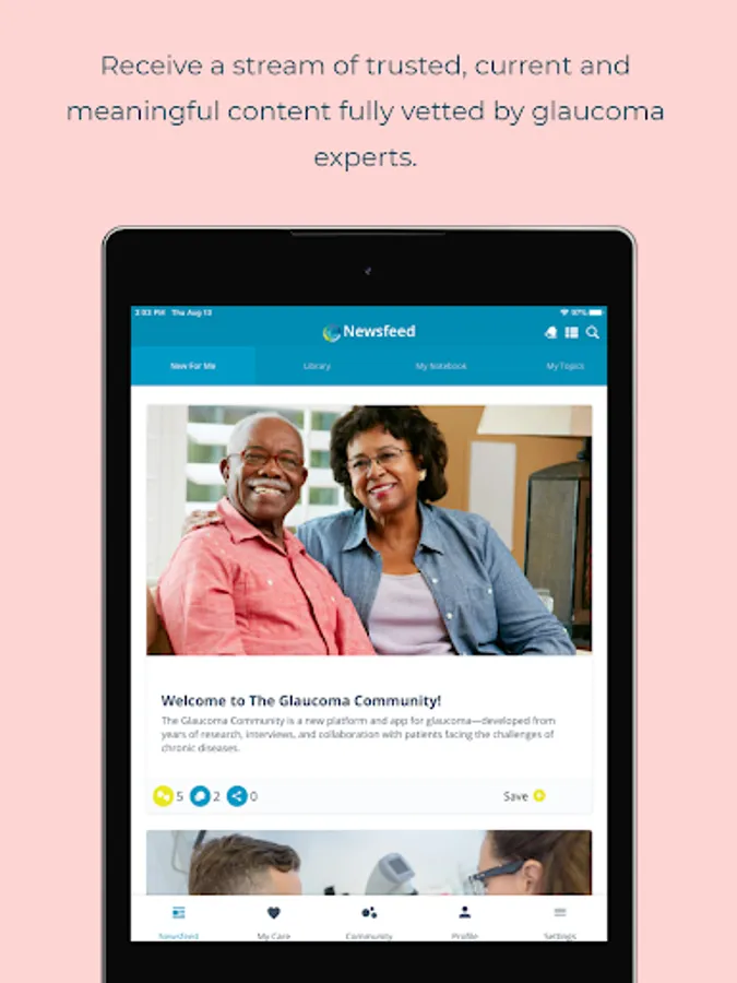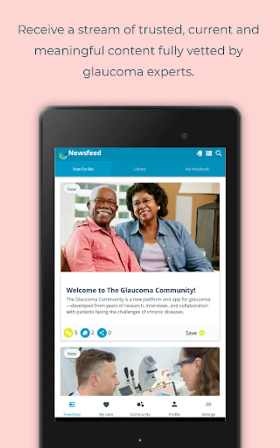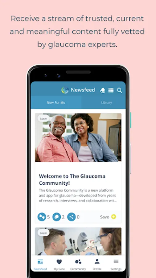 • With The Glaucoma Community app, you’ll receive a continuous stream of updated, Glaucoma-related article summaries on every important topic, including research, treatments, and living tips - all reviewed and vetted by our Content Advisory Council members at Prevent Blindness.