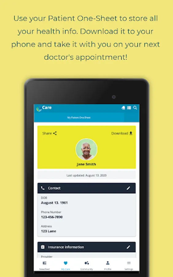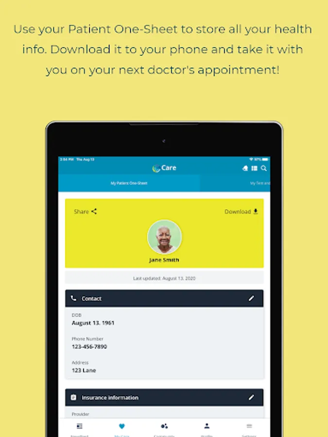 • Keep everything in one place with our Patient One-Sheet, a secure, printable, and shareable form that allows you to easily store and maintain all your basic information – doctors, insurance info, medications, and other key data.