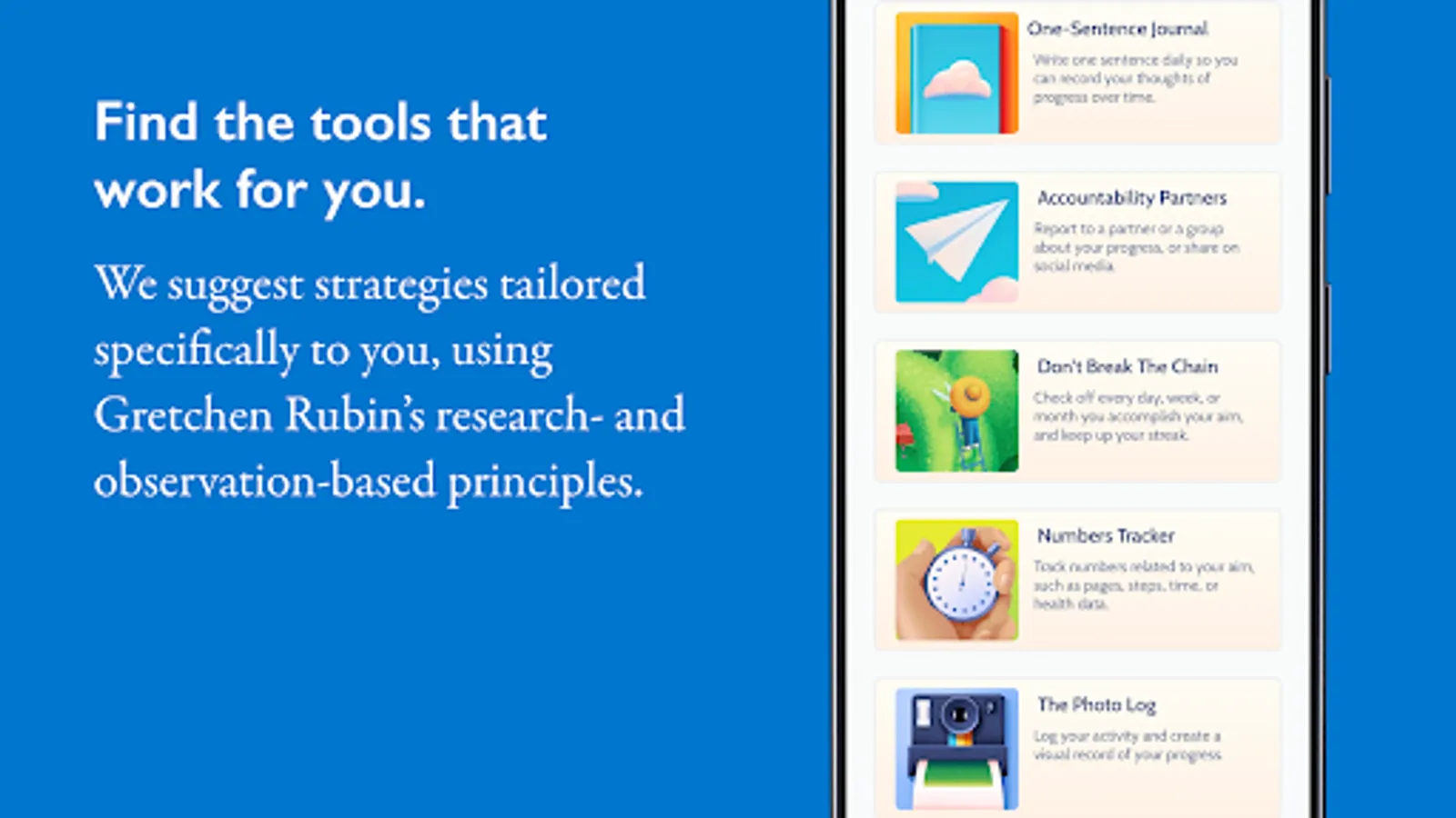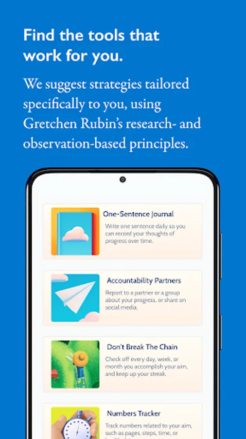 Join the millions of people who have taken Gretchen Rubin’s Four Tendencies quiz to find out whether you’re an Obliger, Questioner, Upholder, or Rebel. This groundbreaking personality framework helps the app recommend the most effective tools for you.