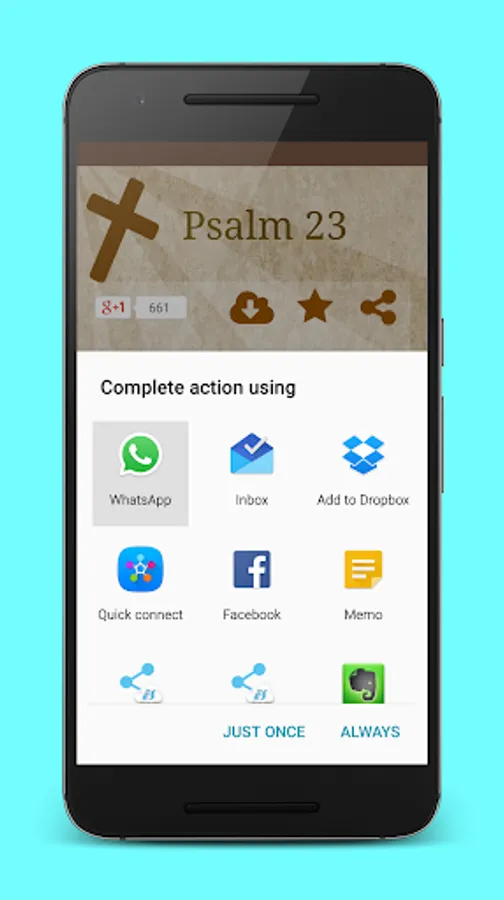 Inside the app you will find the easy share button that allows you to help spread the word via email, instant messaging or social networks. Whenever a friend or family member need words of wisdom and comfort, just choose a psalm press the share button, the words of The Bible come instantly to this person.