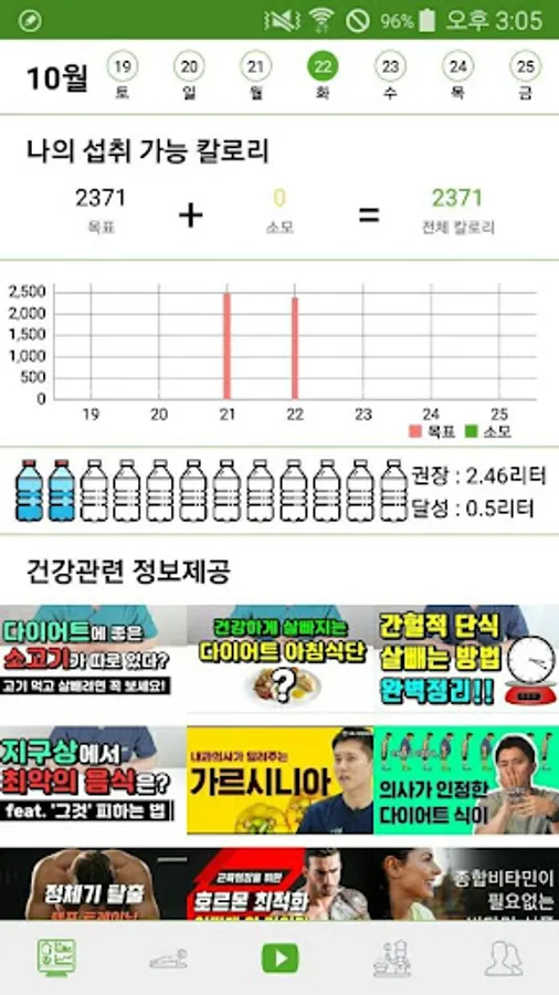 1일 물 권장량의 확인을 통해서 물병 하나에 250ml기준으로 권장 섭취량을 체크할수