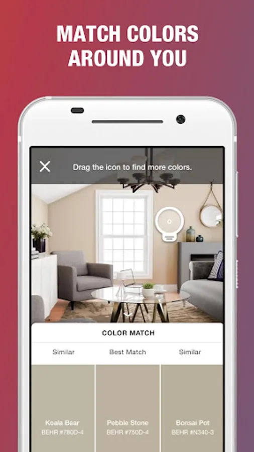 Browse colors right from your phone. Once you’ve found a color, see how it looks in a living room, bedroom, kitchen, bathroom or exterior space. Plus view similar and coordinating paint colors.