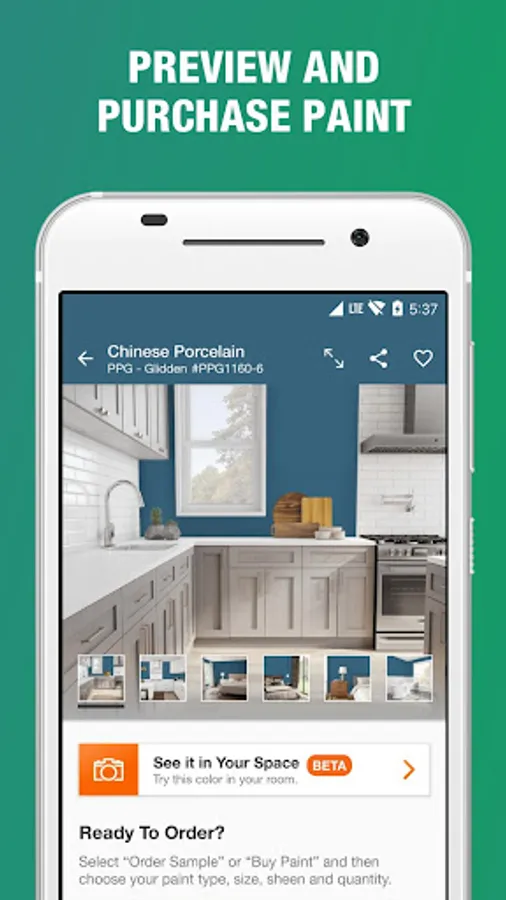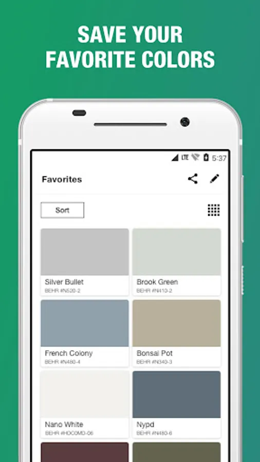 Colors you like can easily be saved to your favorites or shared with a friend via email, text or social media. Once you’ve decided, purchase through the app or use the app to find your nearest Home Depot store.