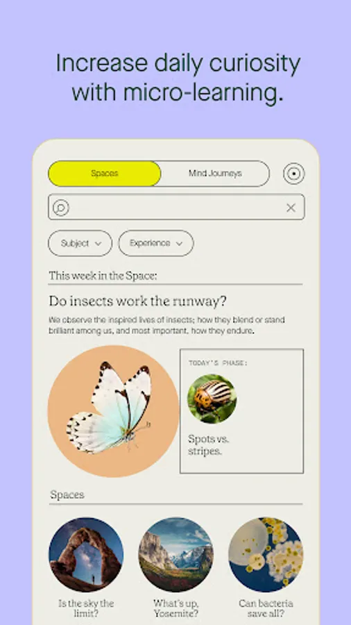 Curious? Here’s how it works: Every week, we launch a new Space–a story series themed around a single curiosity-sparking question, like Is immortality attainable? or Are we wired to love art? Every weekday, you’ll unlock a new multimedia story, presented in three engaging, quick-hit experiences: Lingo, Immerse, and Deep Think. Lingo teaches you a new word each day through meditative audio tracks; Immerse cultivates lifelong learning with deep dives into topics ranging from fungi to philosophy; and Deep Think cultivates contemplation, self-reflection, and mindfulness with interactive prompts. On weekends, take a relaxing mental vacation with Mind Journeys™, guided visualizations that transport you to awe-inspiring locations, from Iceland to the Grand Canyon.