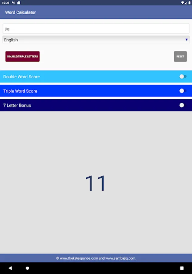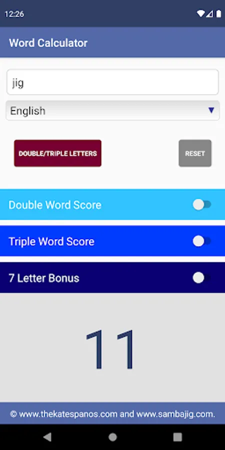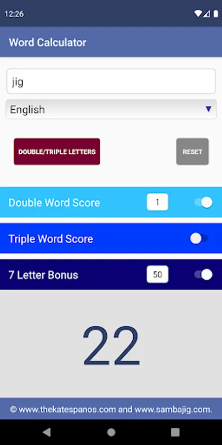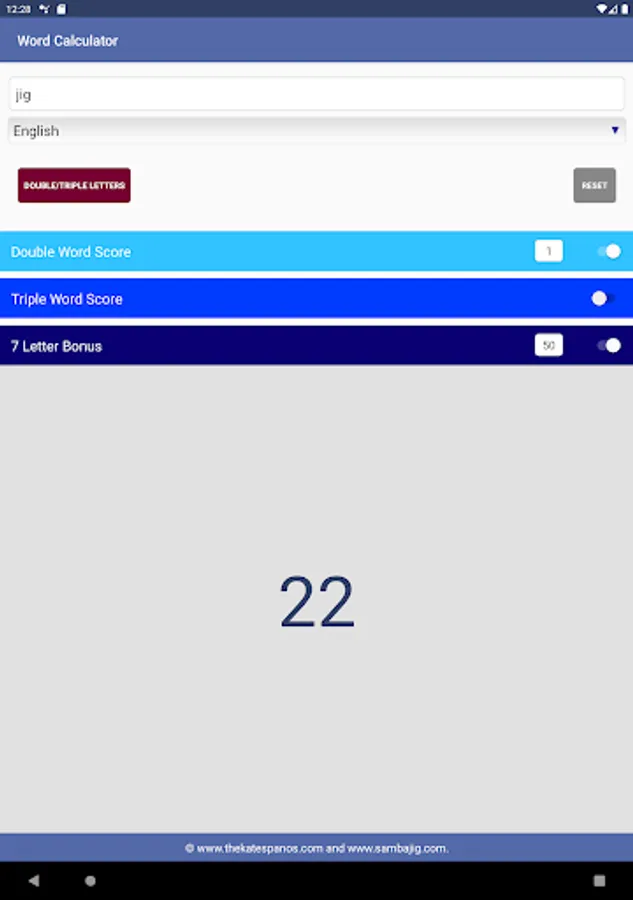 Includes options for double and triple word scores and 7-letter bonus scores. A separate screen allows for double and triple letter scores with an easy tap of the letter tile.