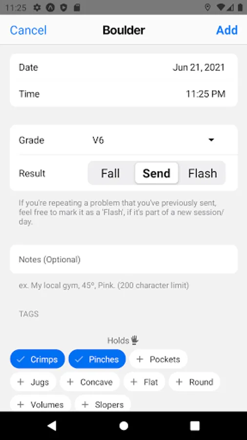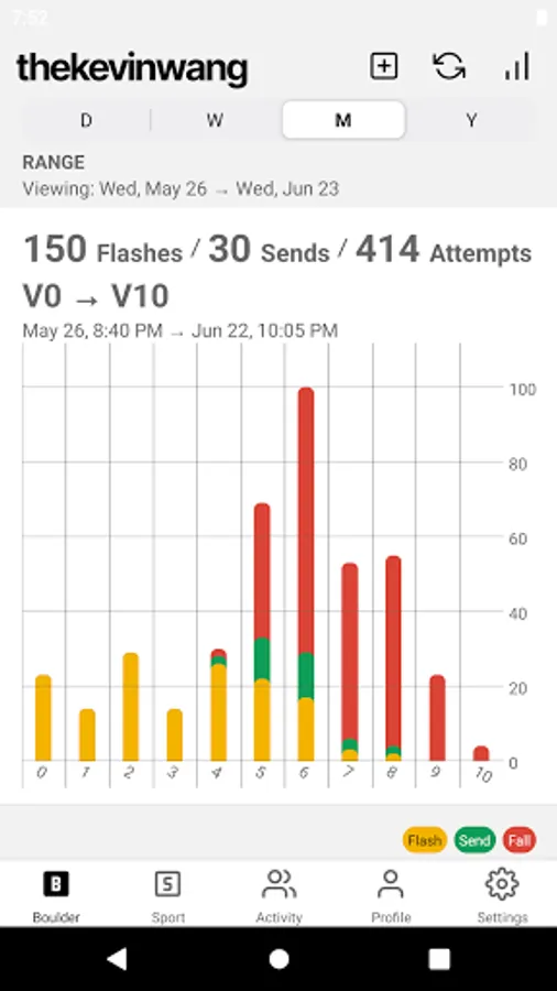 Log all your climbing attempts as "Flash/Send/Onsight/Redpoint/Fall" and see a nice graph visualization, sorted by date.
